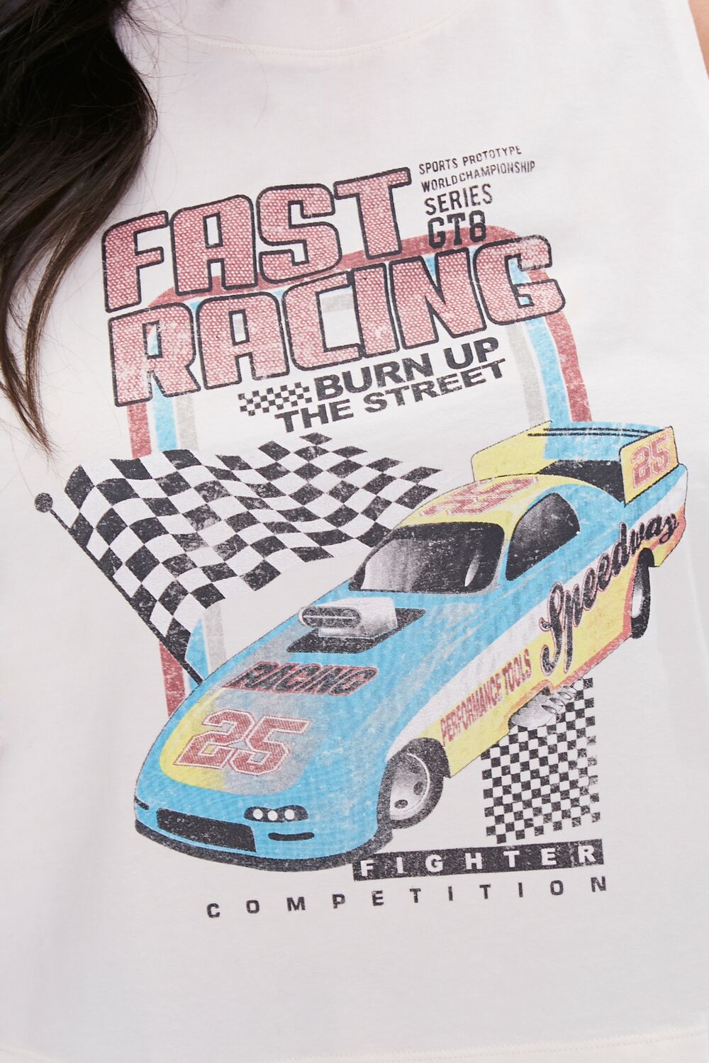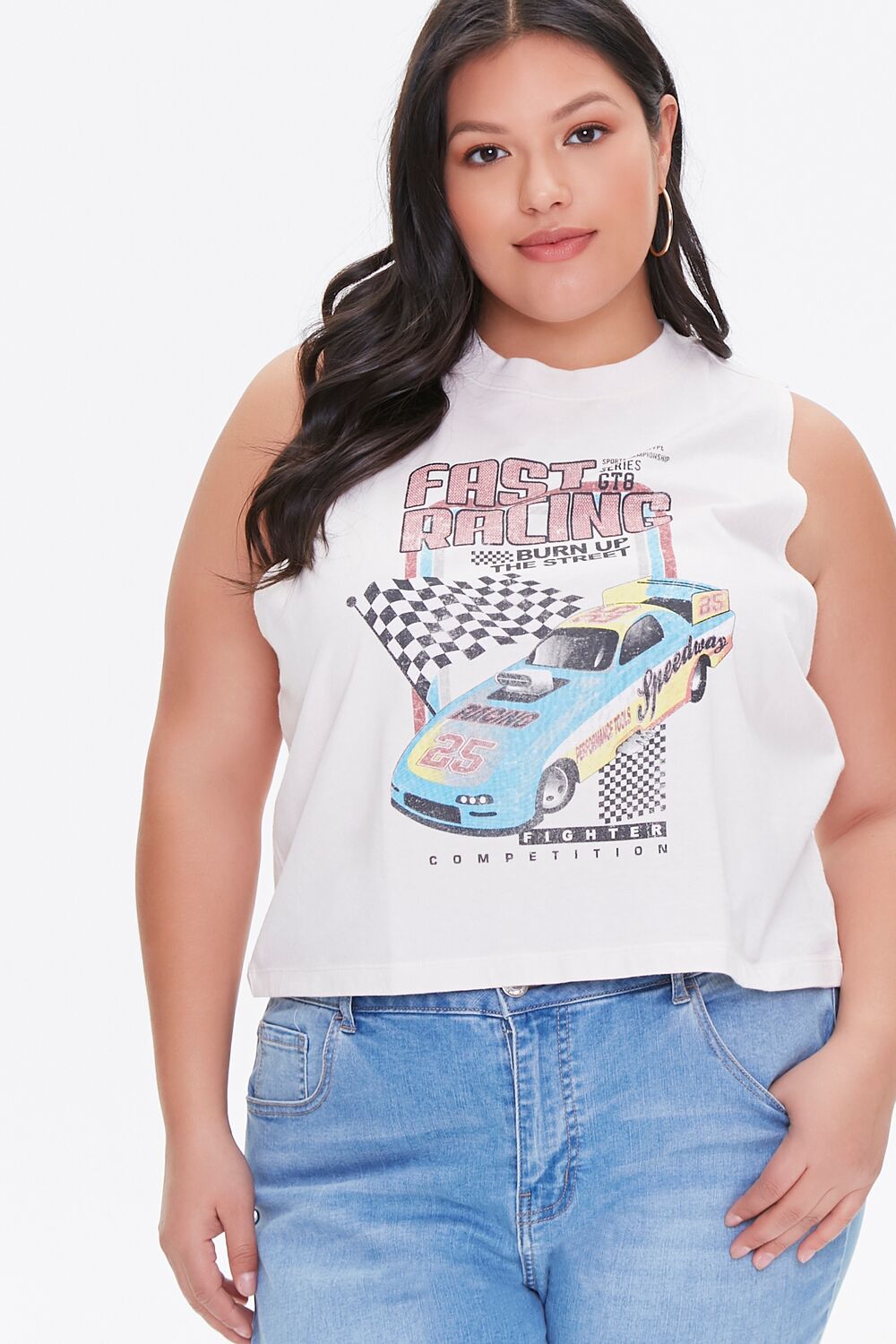 Forever 21+ – A knit cropped muscle tee featuring front ‘Fast Racing’ text and car graphics. sleeveless design. and a crew neck.