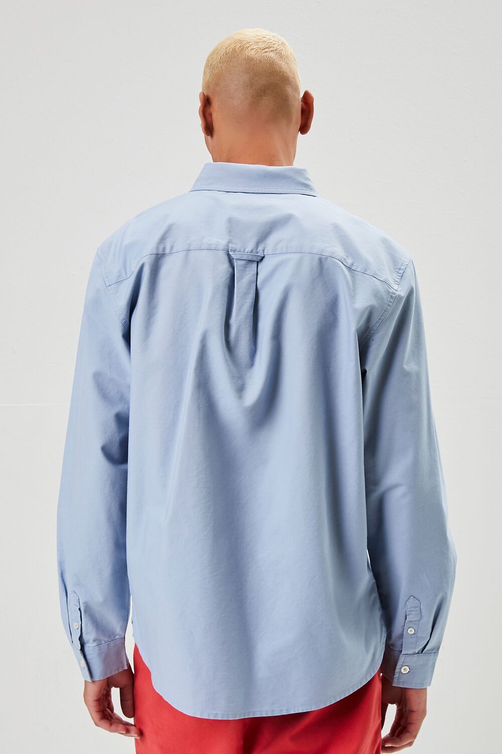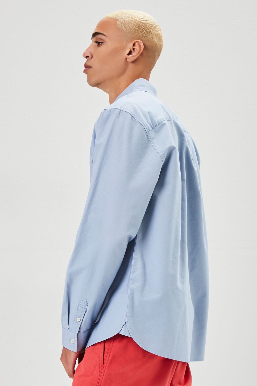 A woven shirt featuring a basic collar. chest patch pocket. button-front closures. dropped long sleeves. and a scoop hem.