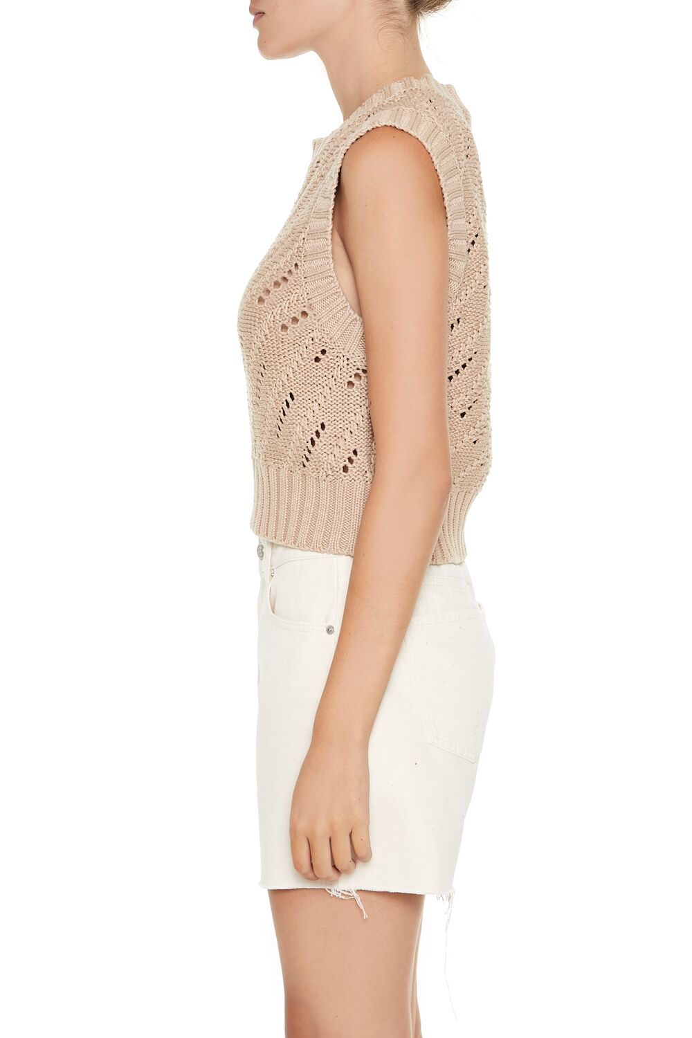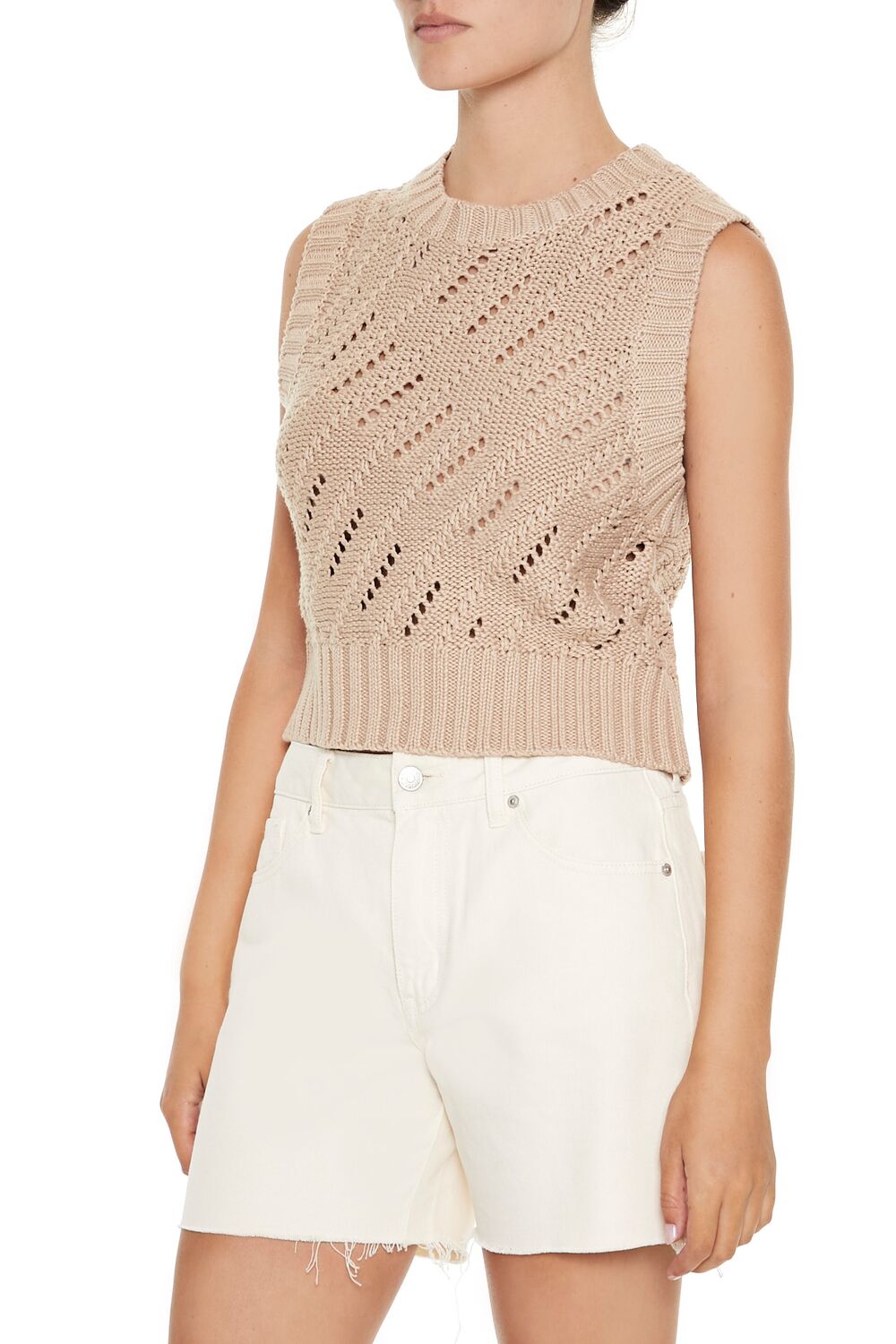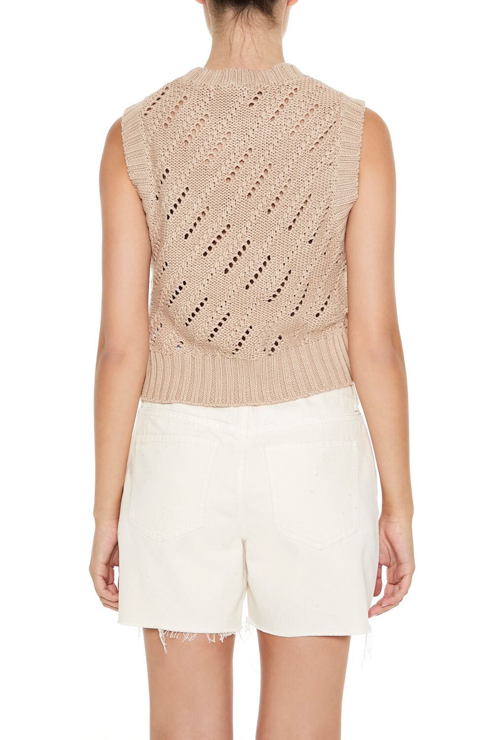 A Pointelle knit sweater vest featuring ribbed trim. cropped hem. and a round neckline.