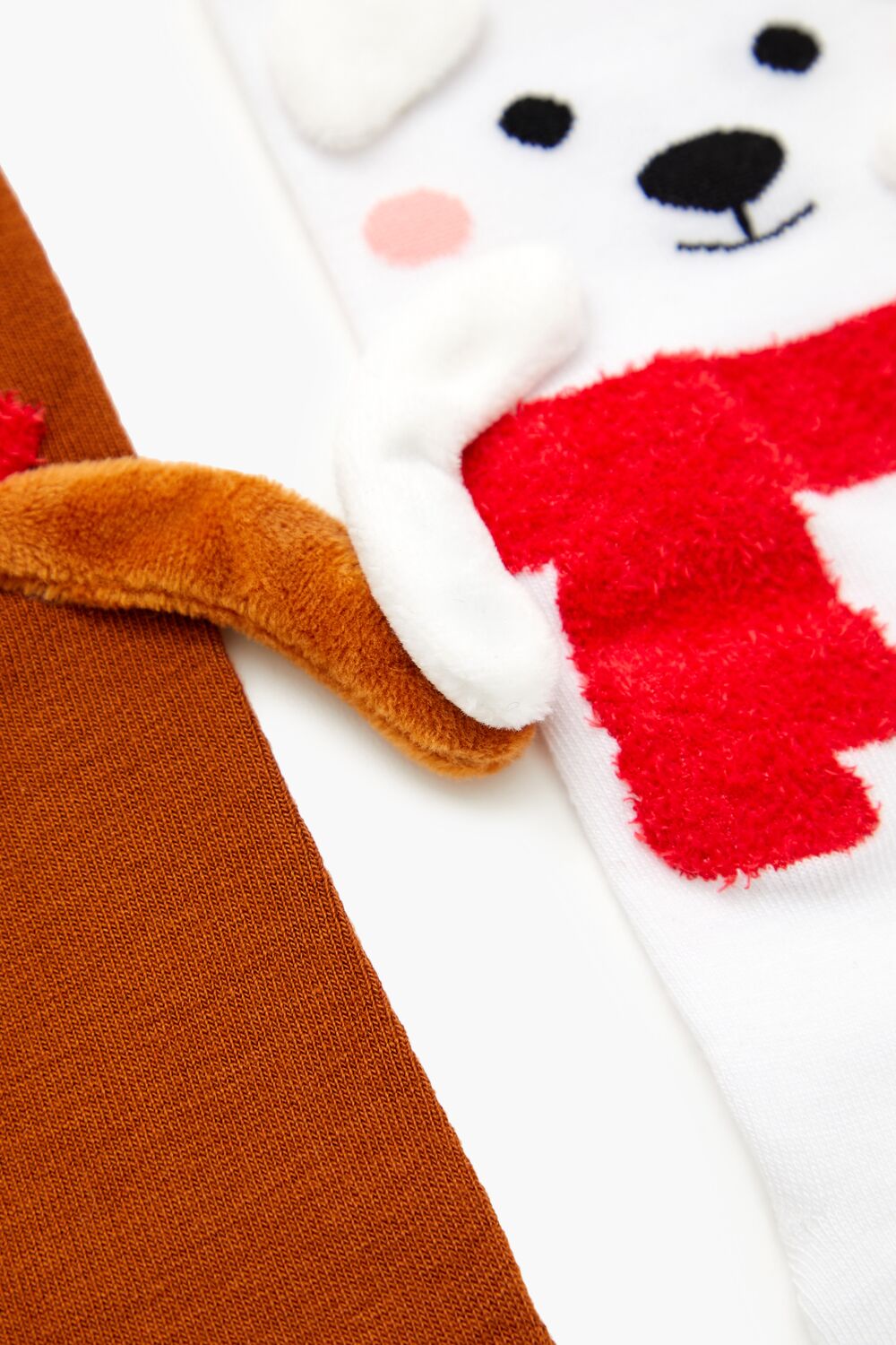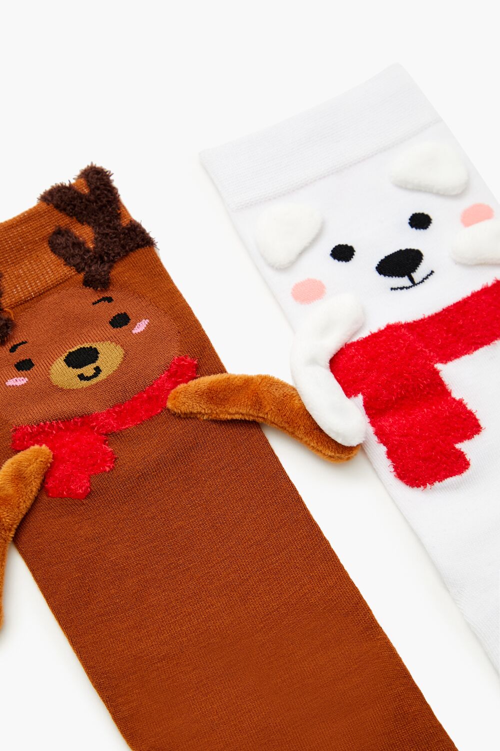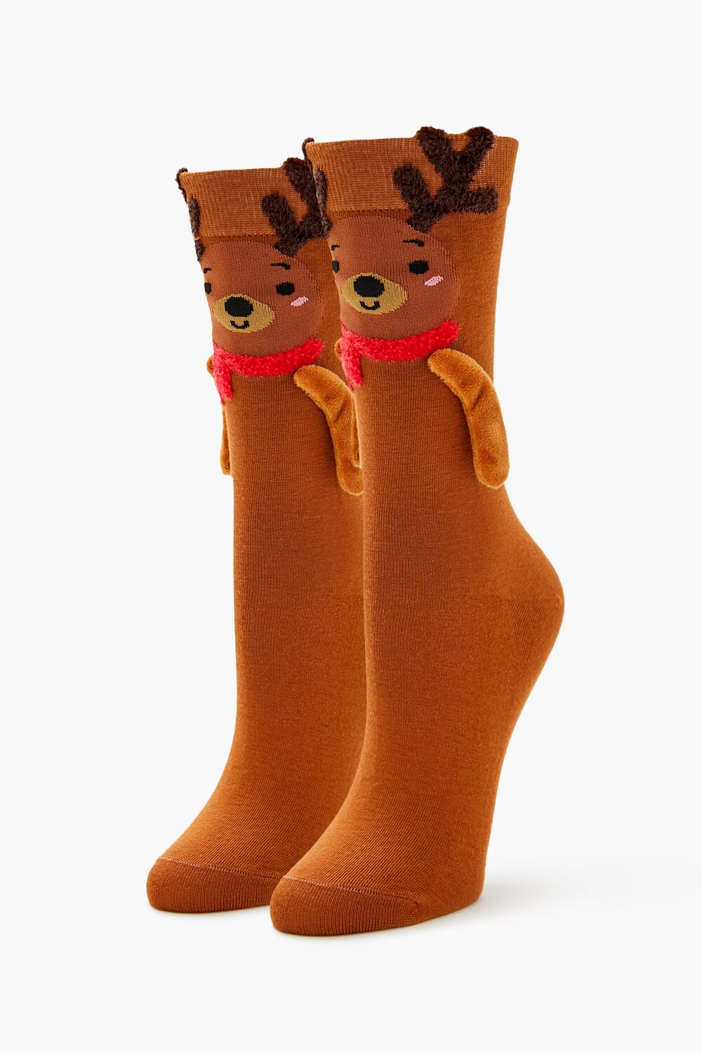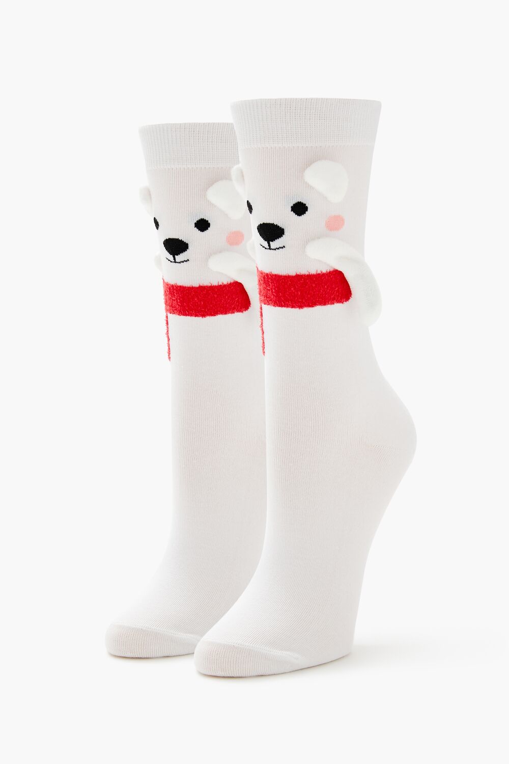 A set of knit crew socks featuring polar bear and reindeer designs with protruding arms.
