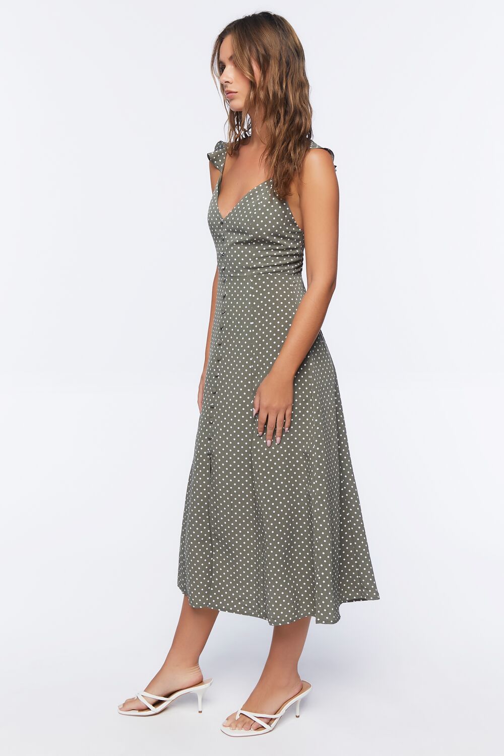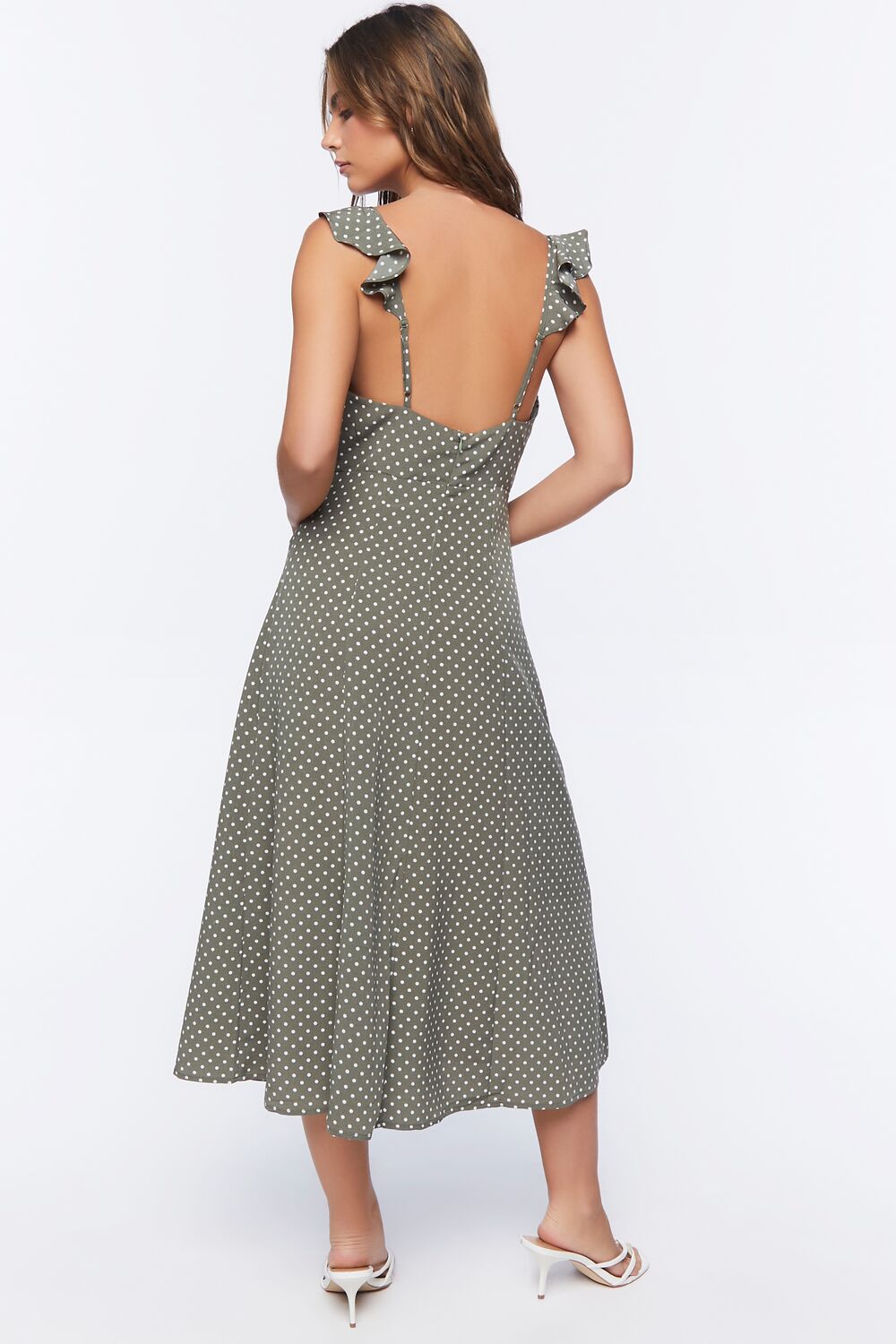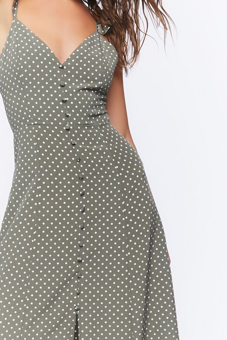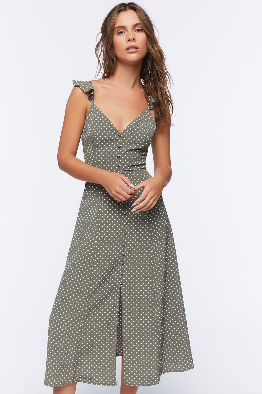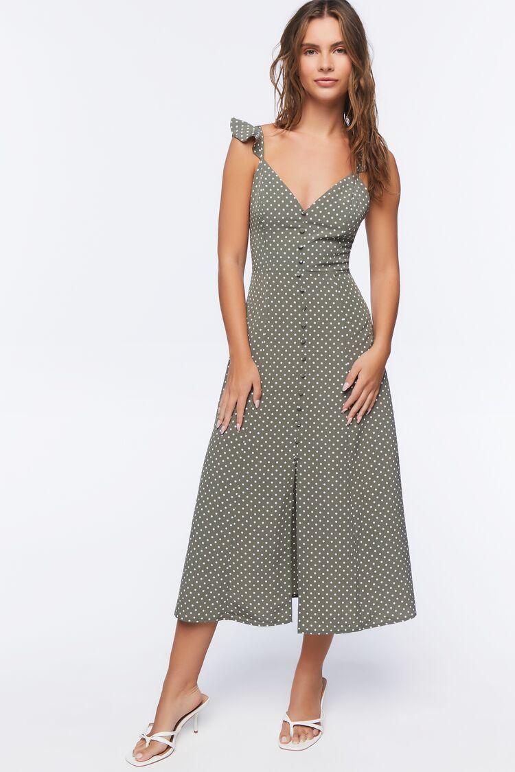 A woven midi dress featuring an allover polka dot print. cami straps with flounce trim. front button closures. a front slit. and concealed back zipper.