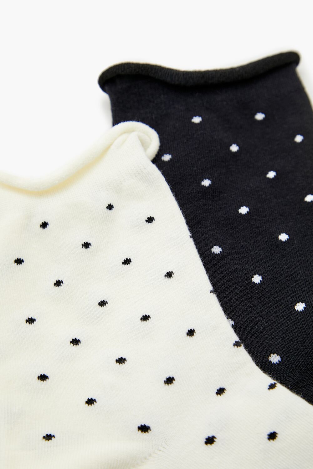 A set of knit crew socks featuring ribbed trim and an allover polka dot pattern.