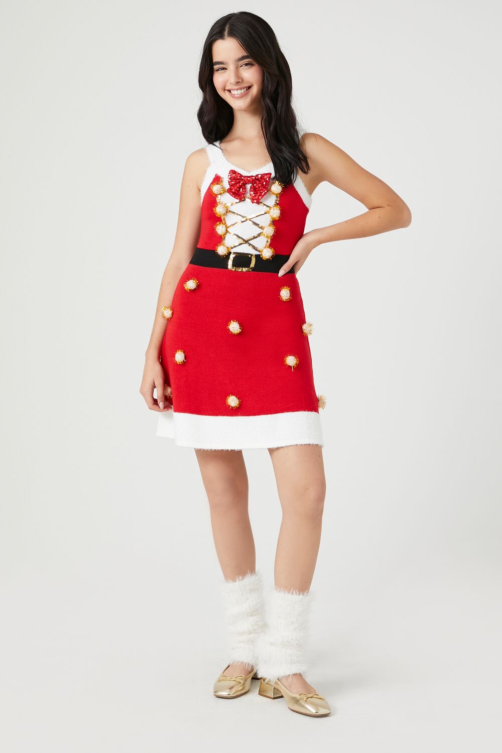 A knit mini dress featuring a Santa design. round neckline. shoulder straps. square-cut back. front bow. pom pom. and sequin embellishments. and A-line silhouette.