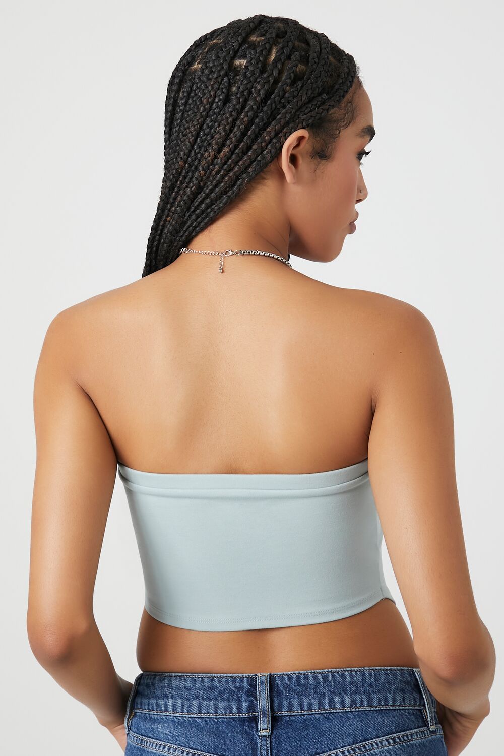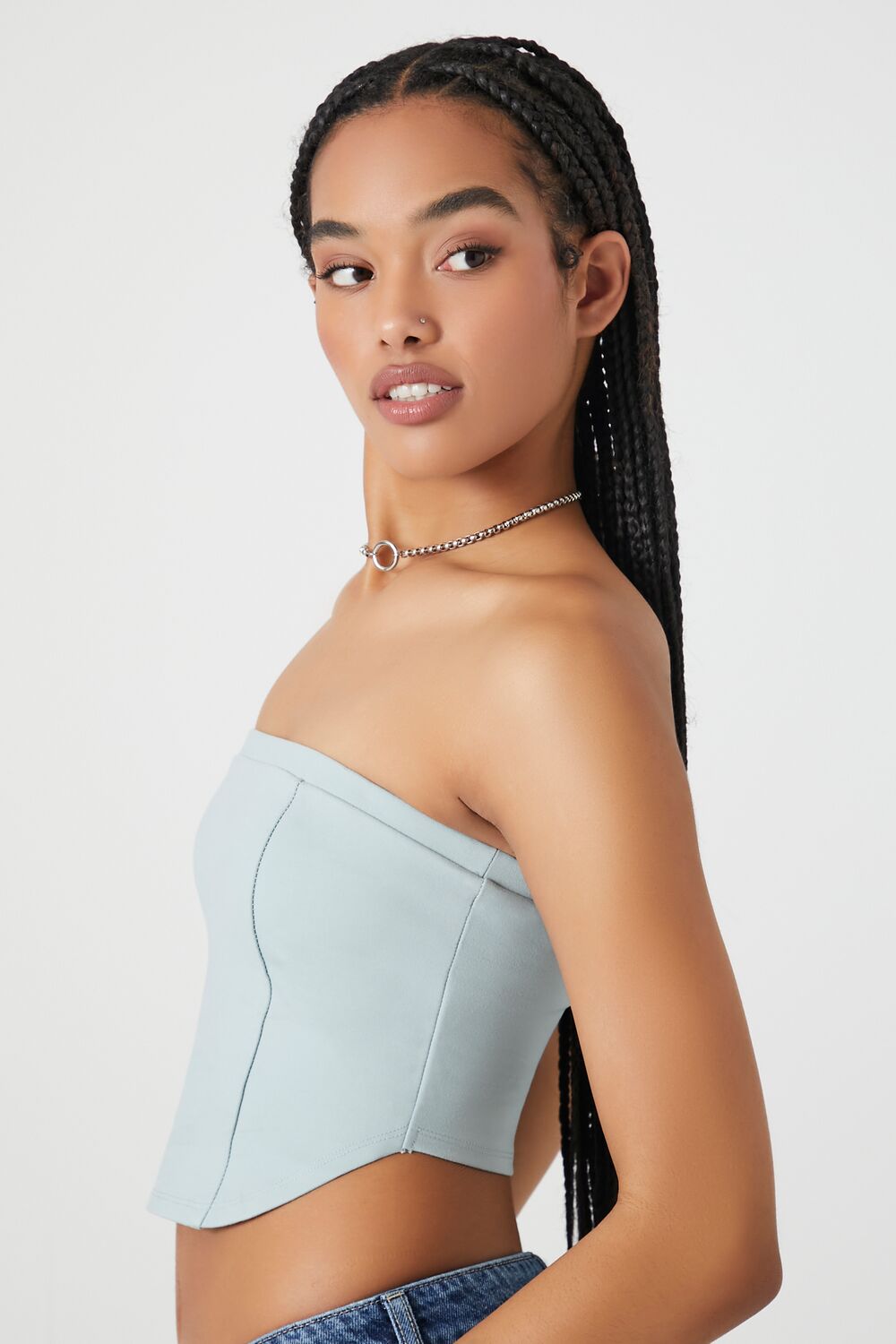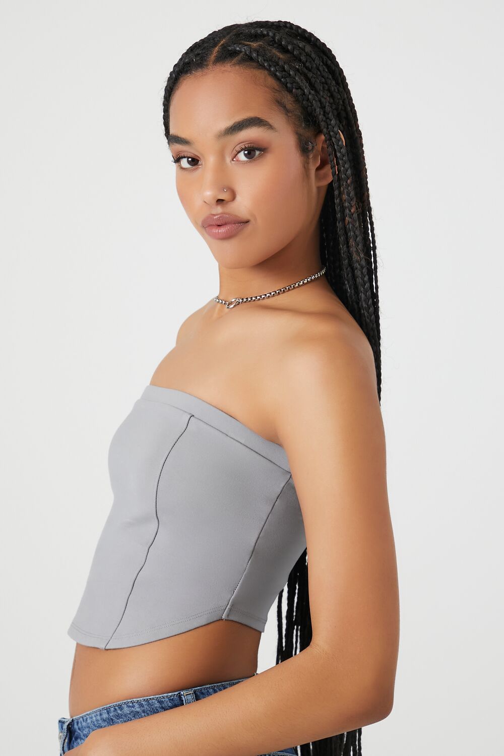 A Ponte knit tube top featuring a straight-cut neckline and back. seamed construction. and a curved reverse high-low hem.