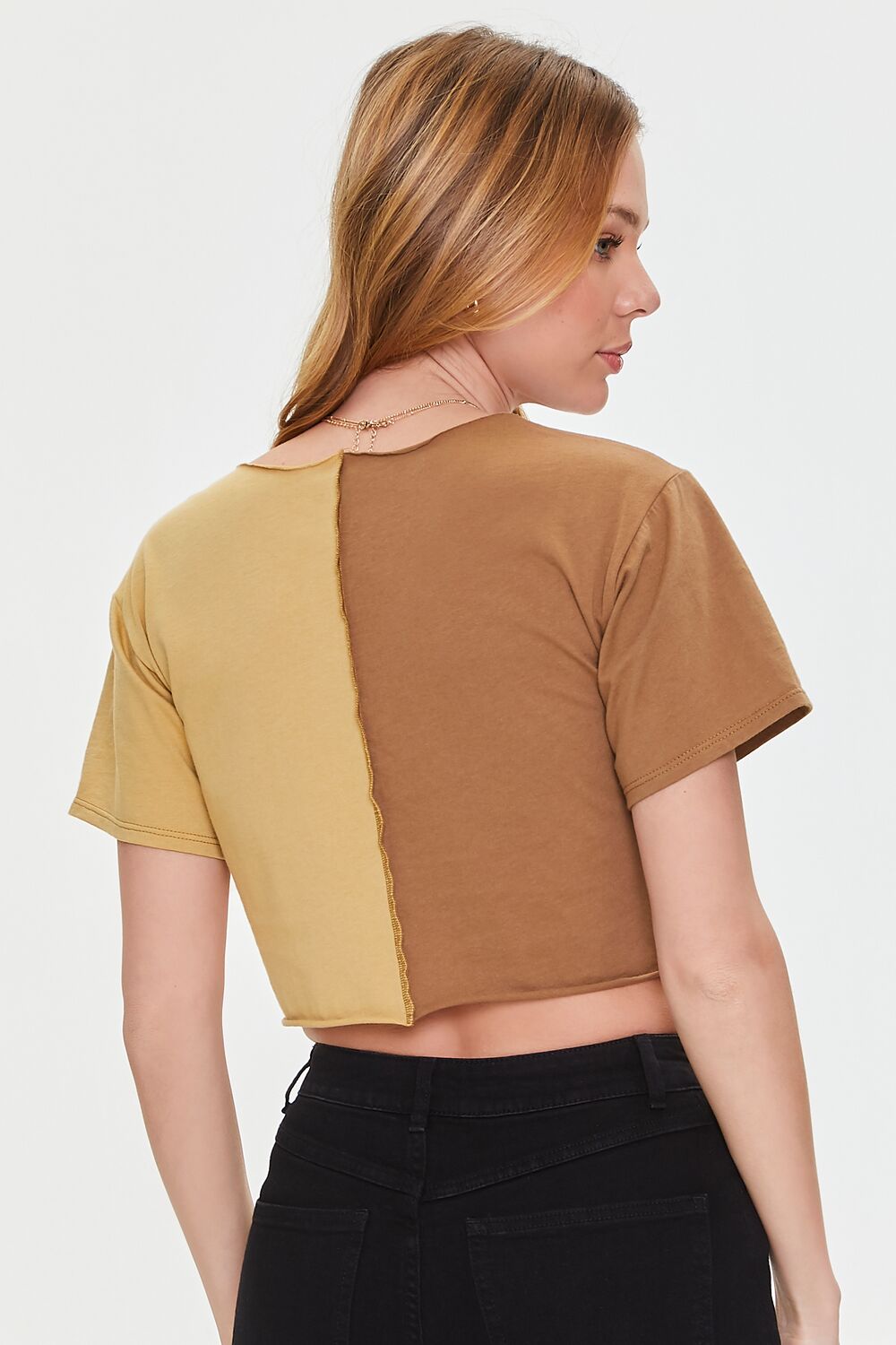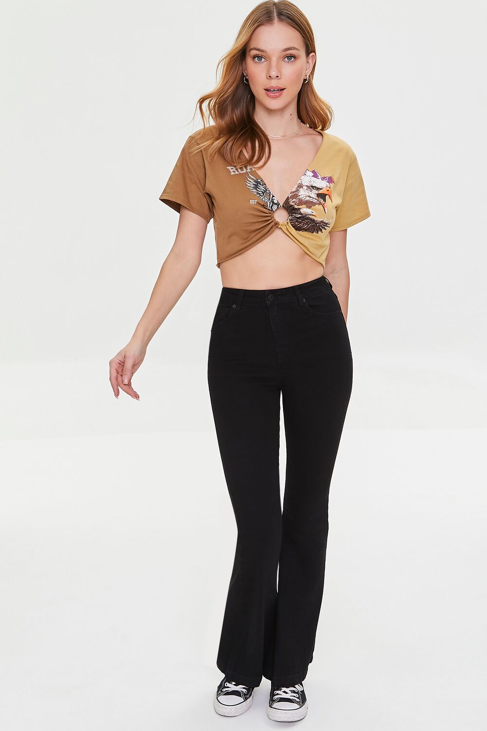 A knit crop top featuring a reworked design. eagle graphic. short sleeves. plunging neckline. front round cutout. and a tulip hem.