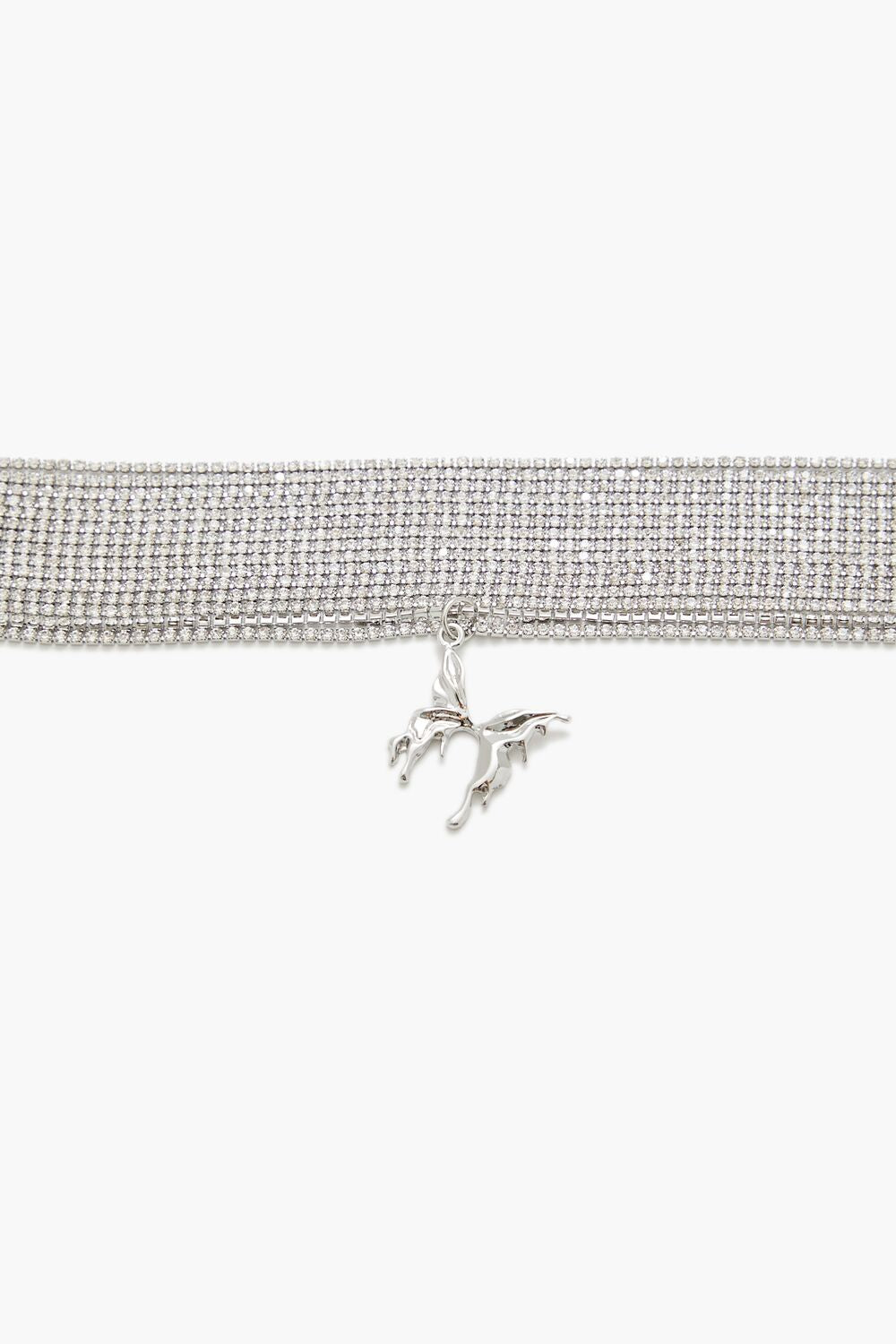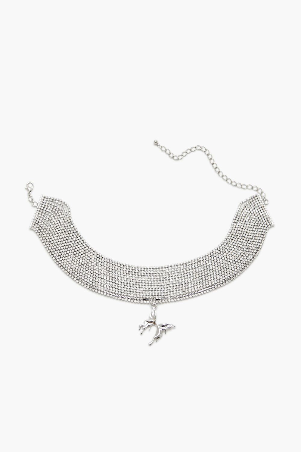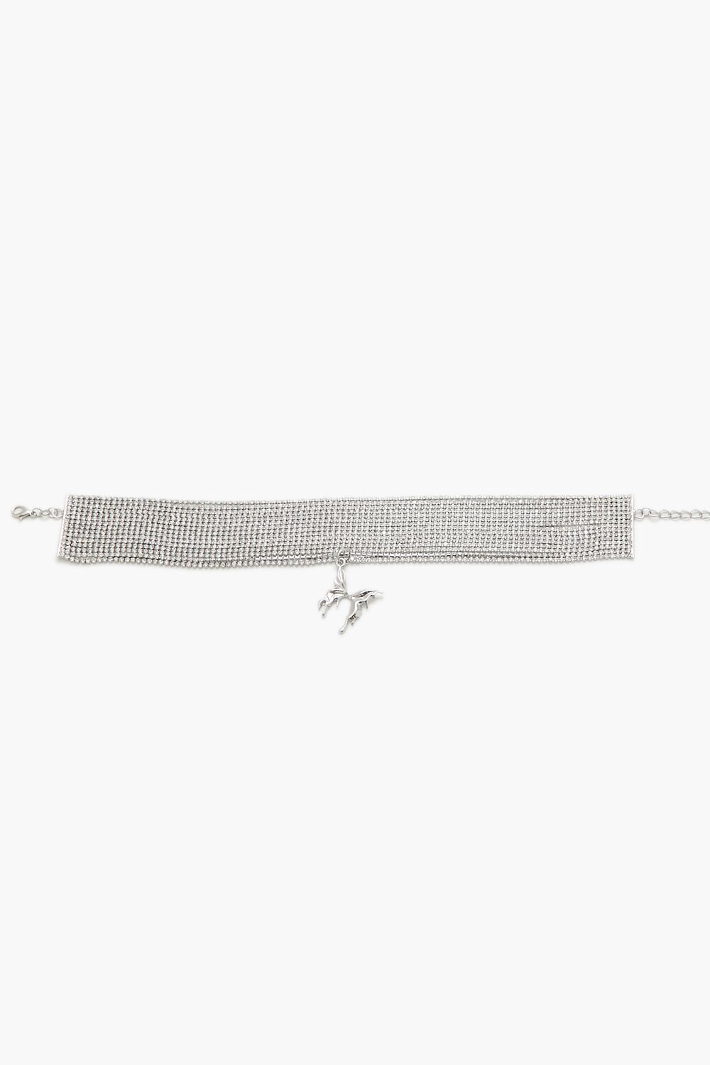 A high-polish choker necklace featuring a tiered construction. rhinestone box chains. heart pendant. and lobster-clasp closure.