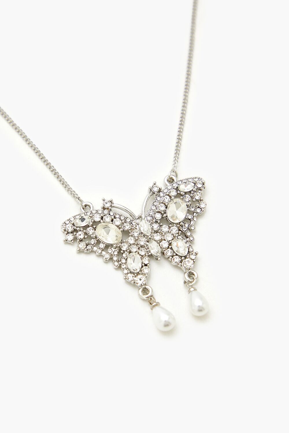 A high-polish necklace featuring a curb chain. centered butterfly pendant with rhinestone and dangling faux pearl bead embellishments. and lobster-clasp closure.