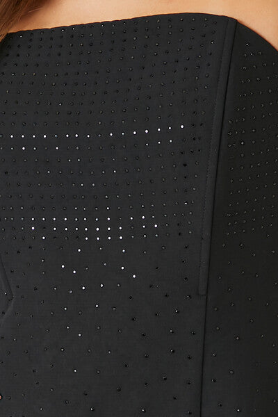 A woven mini tube dress featuring a straight-cut neckline and back. allover rhinestone embellishments. princess seams. concealed back zipper. and bodycon silhouette.