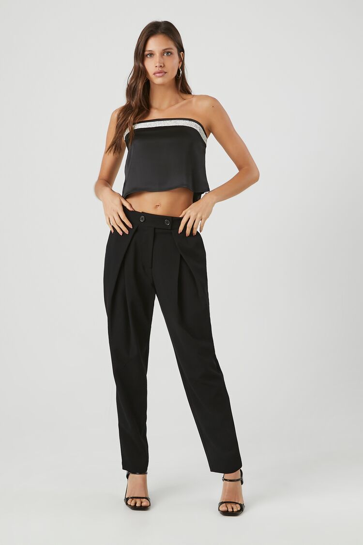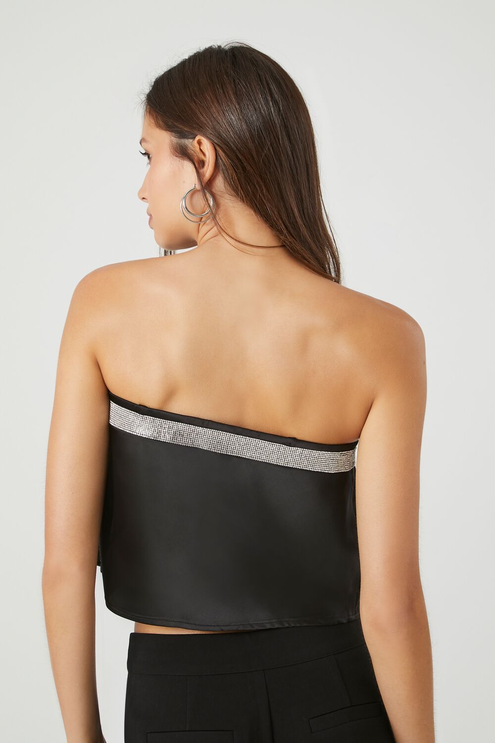 A satin crop top featuring rhinestone trim. strapless cut. straight-cut neckline and back. and a relaxed fit.