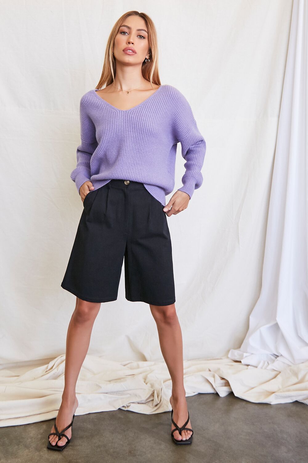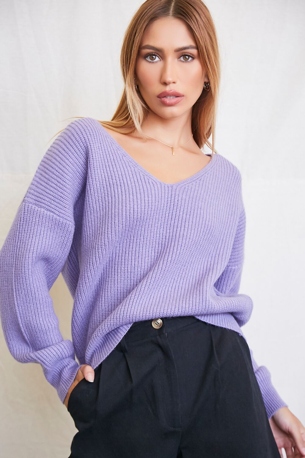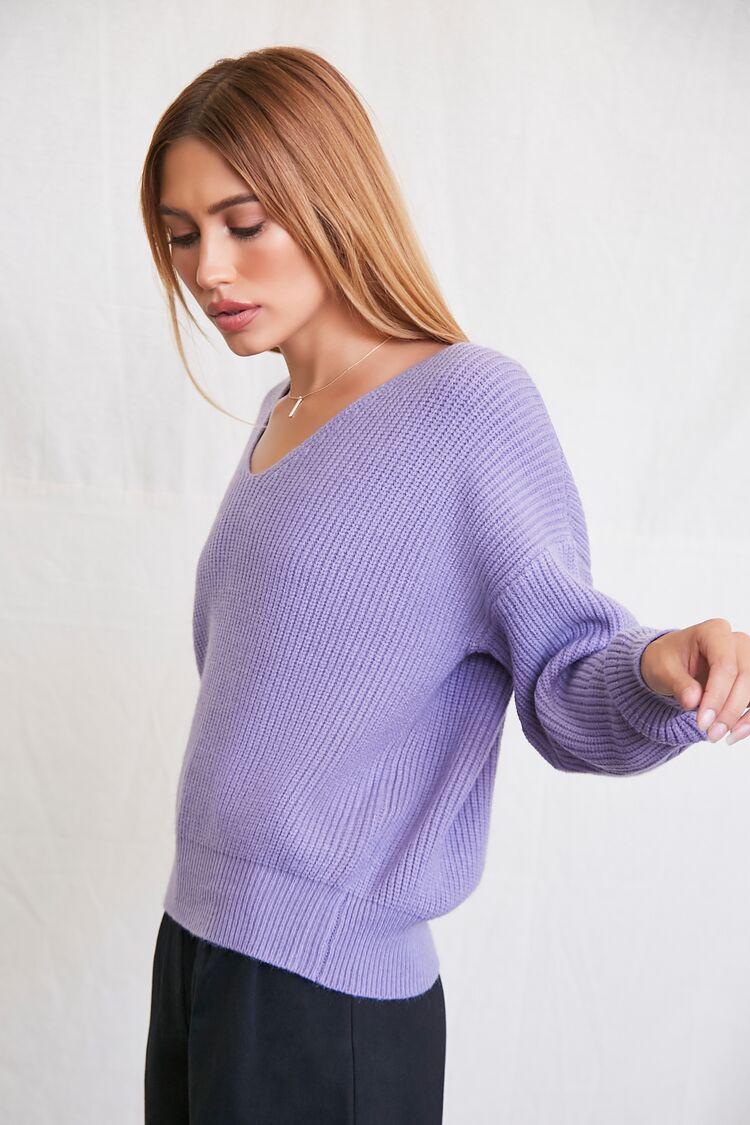 Style Deals – A knit sweater featuring an allover ribbed construction. V-neckline. and dropped long sleeves.