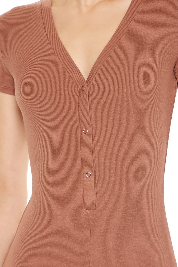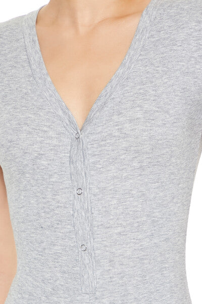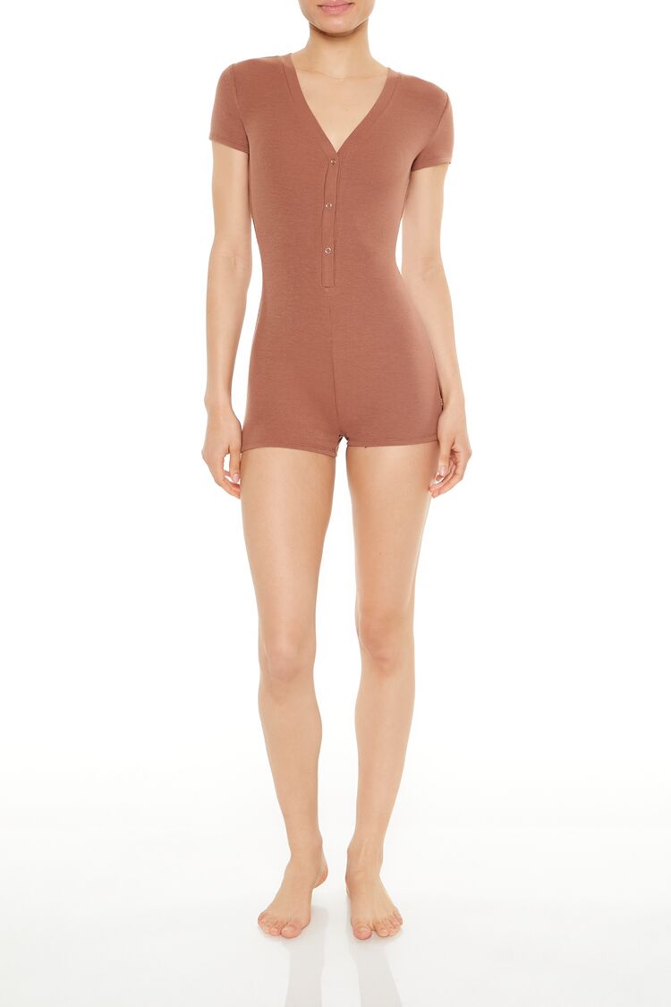 A ribbed knit lounge romper featuring button-front closures. short sleeves. and lettuce-edge trim.