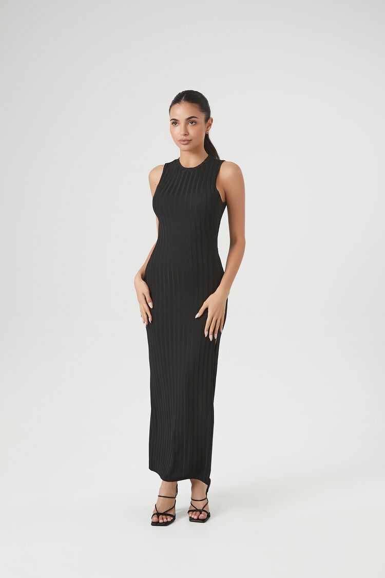 A ribbed knit maxi dress featuring a round neckline. sleeveless cut. side leg slit. and bodycon silhouette.
