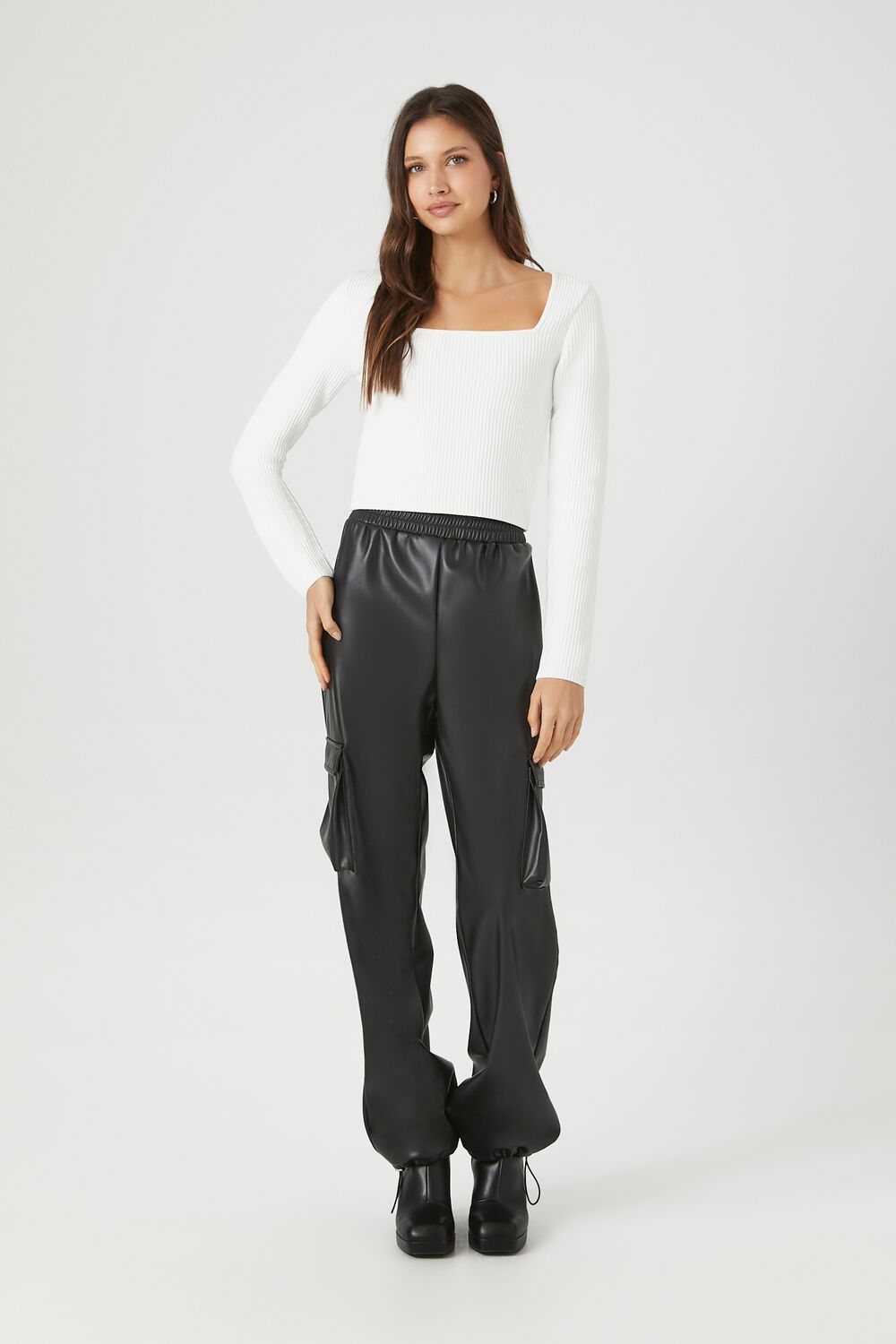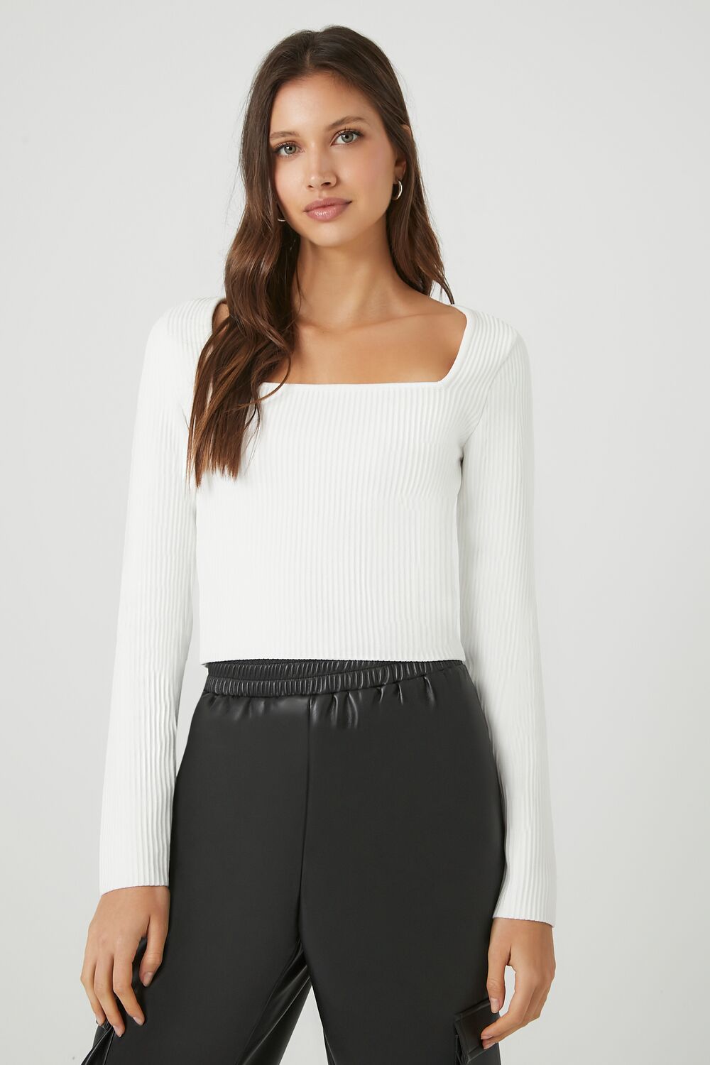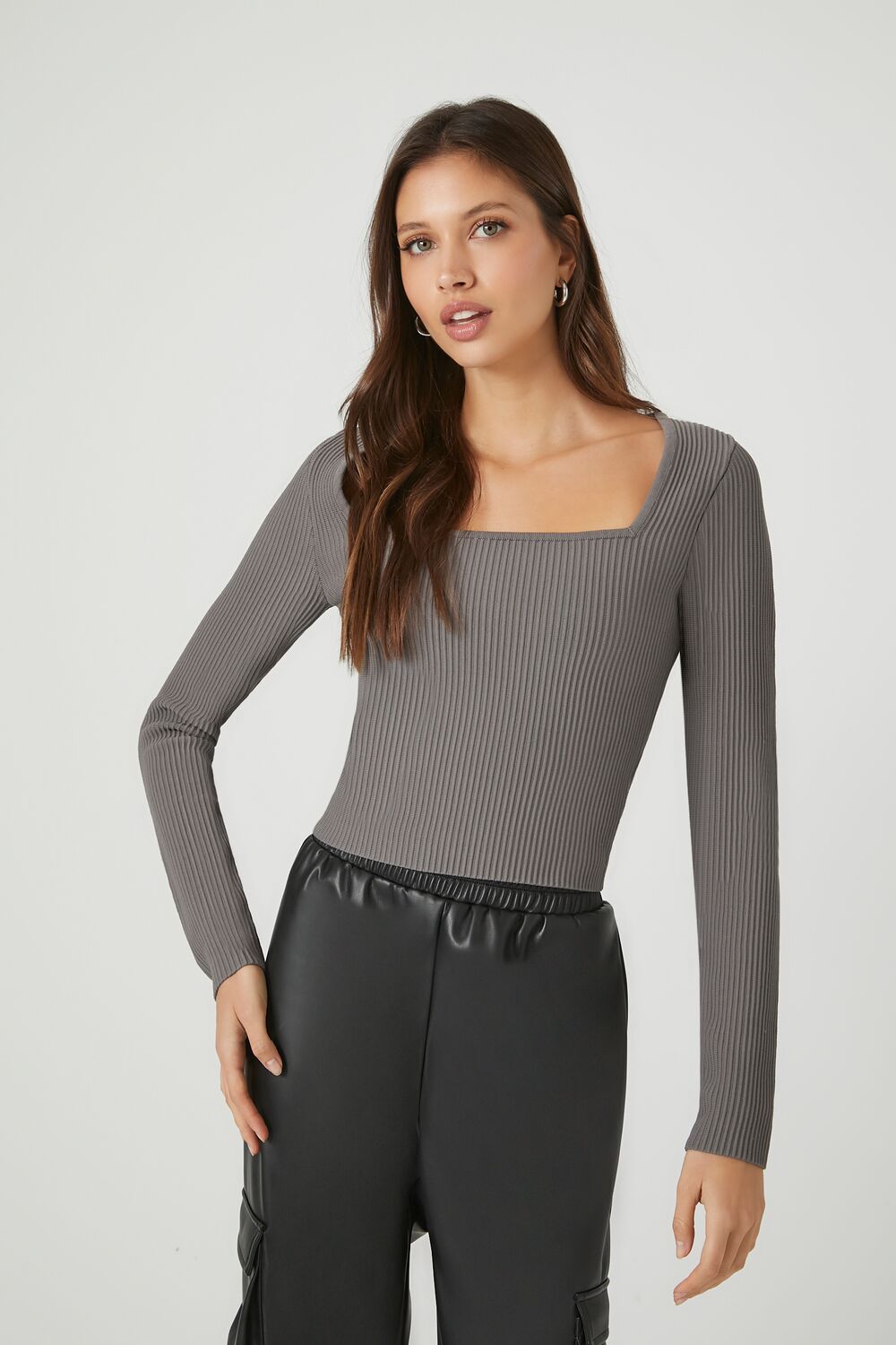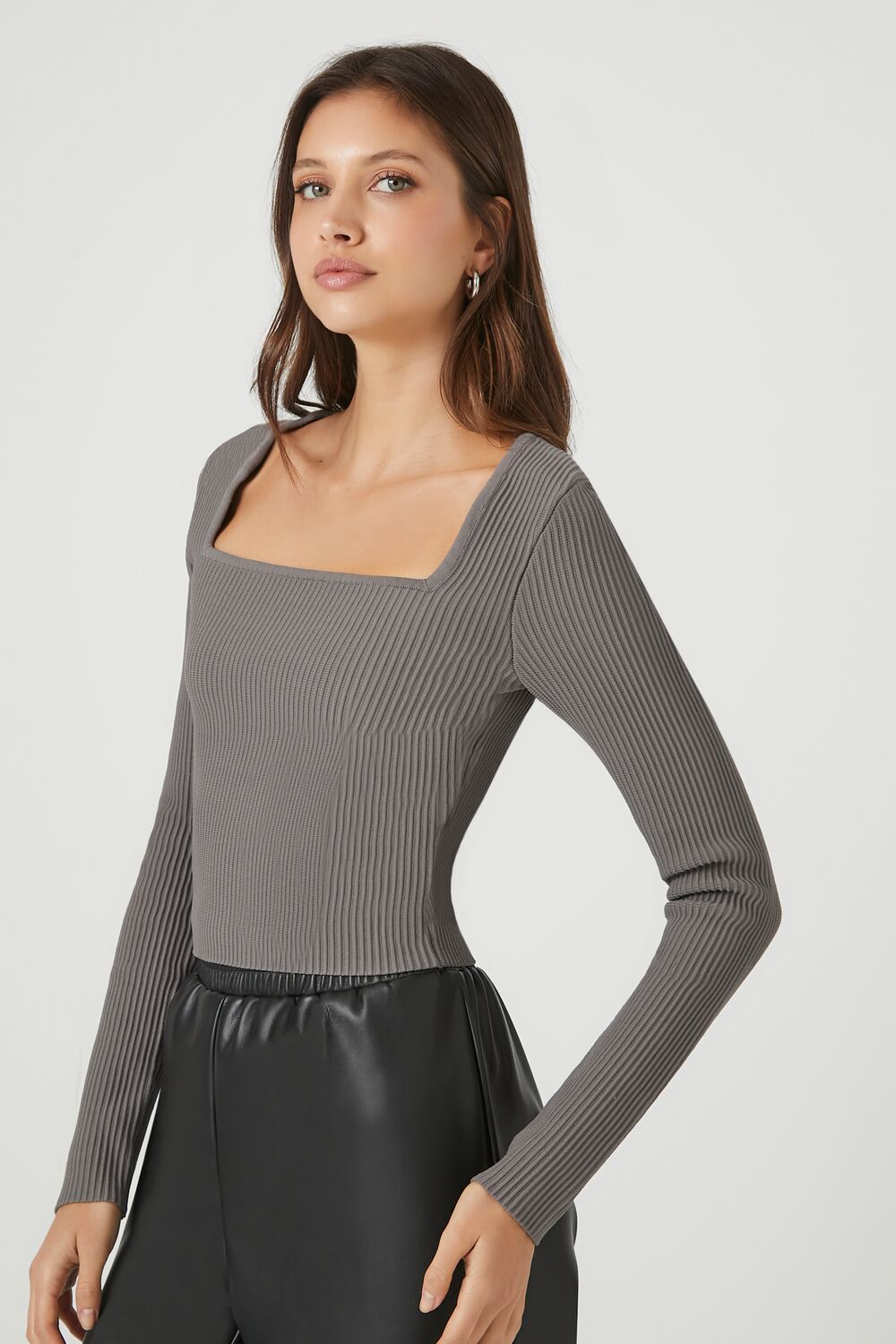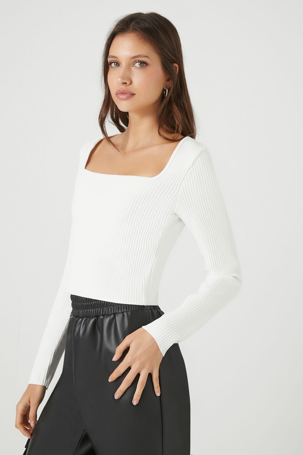 A ribbed knit sweater featuring a square neckline. long sleeves. and a fitted silhouette.