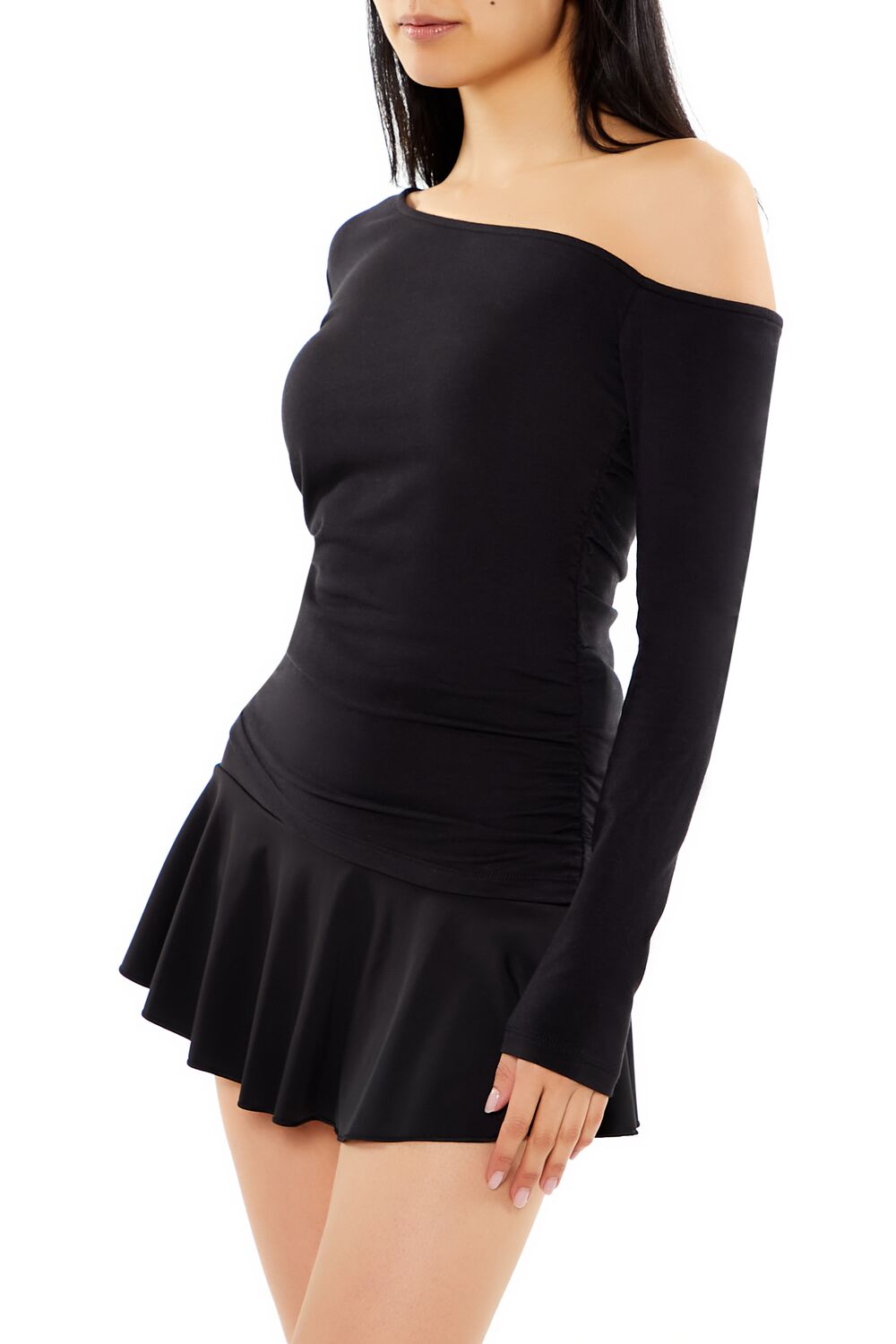 A jersey knit top featuring an off-the-shoulder neckline. long sleeves. and ruched side design.