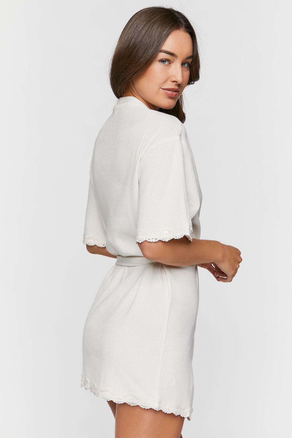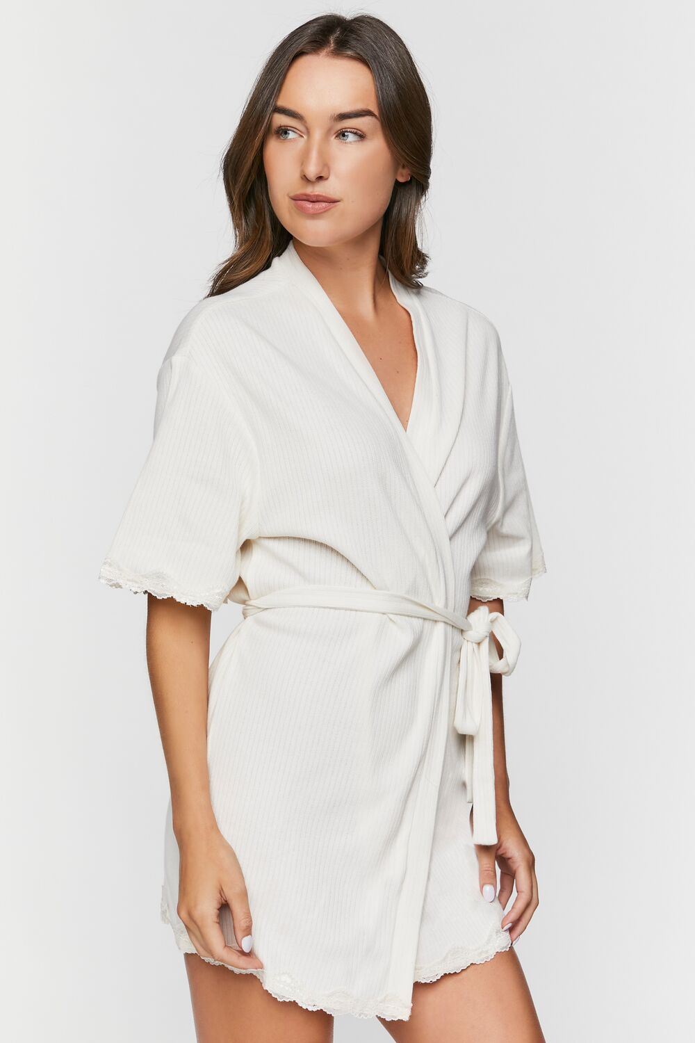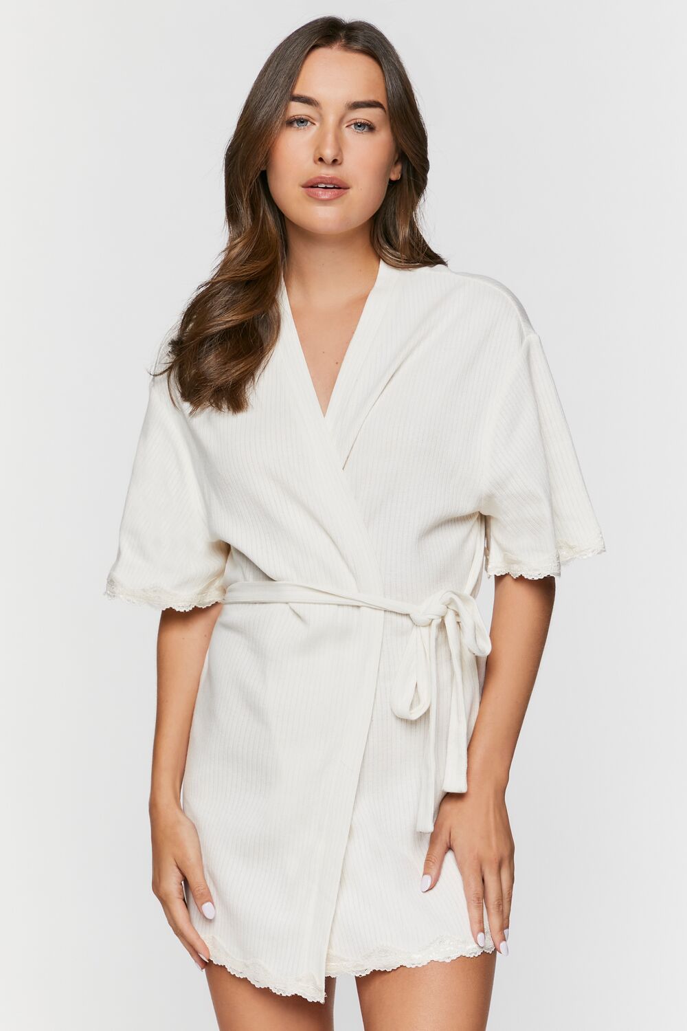 A ribbed knit lingerie robe featuring an open front. self-tie sash belt. dropped short sleeves. and scalloped lace trim.