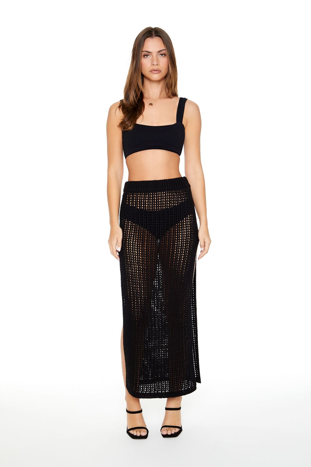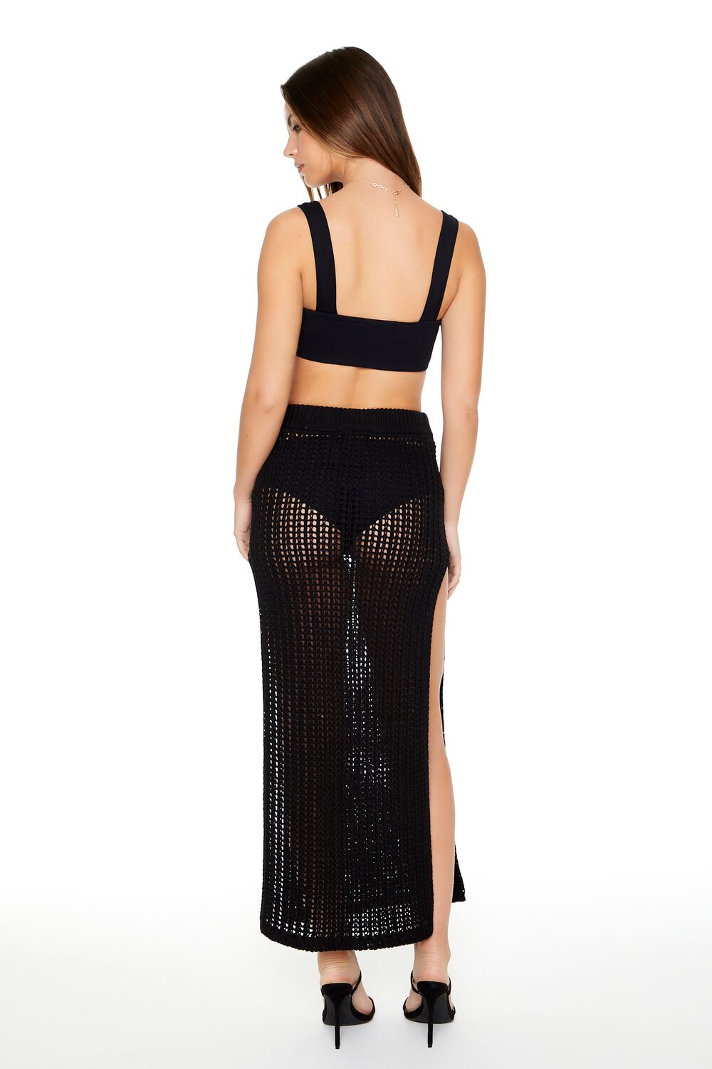 A crochet maxi skirt featuring a leg slit and stretchy ribbed waistband.
