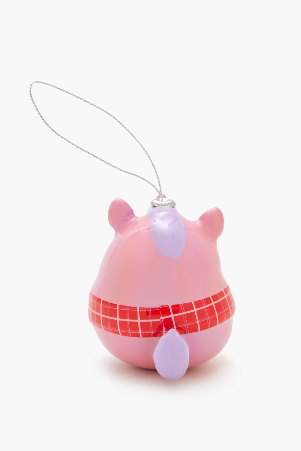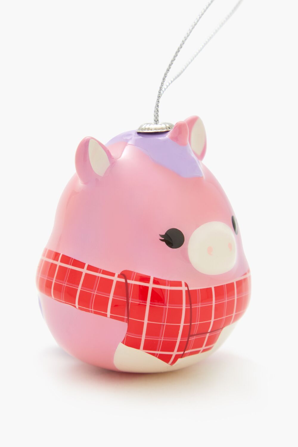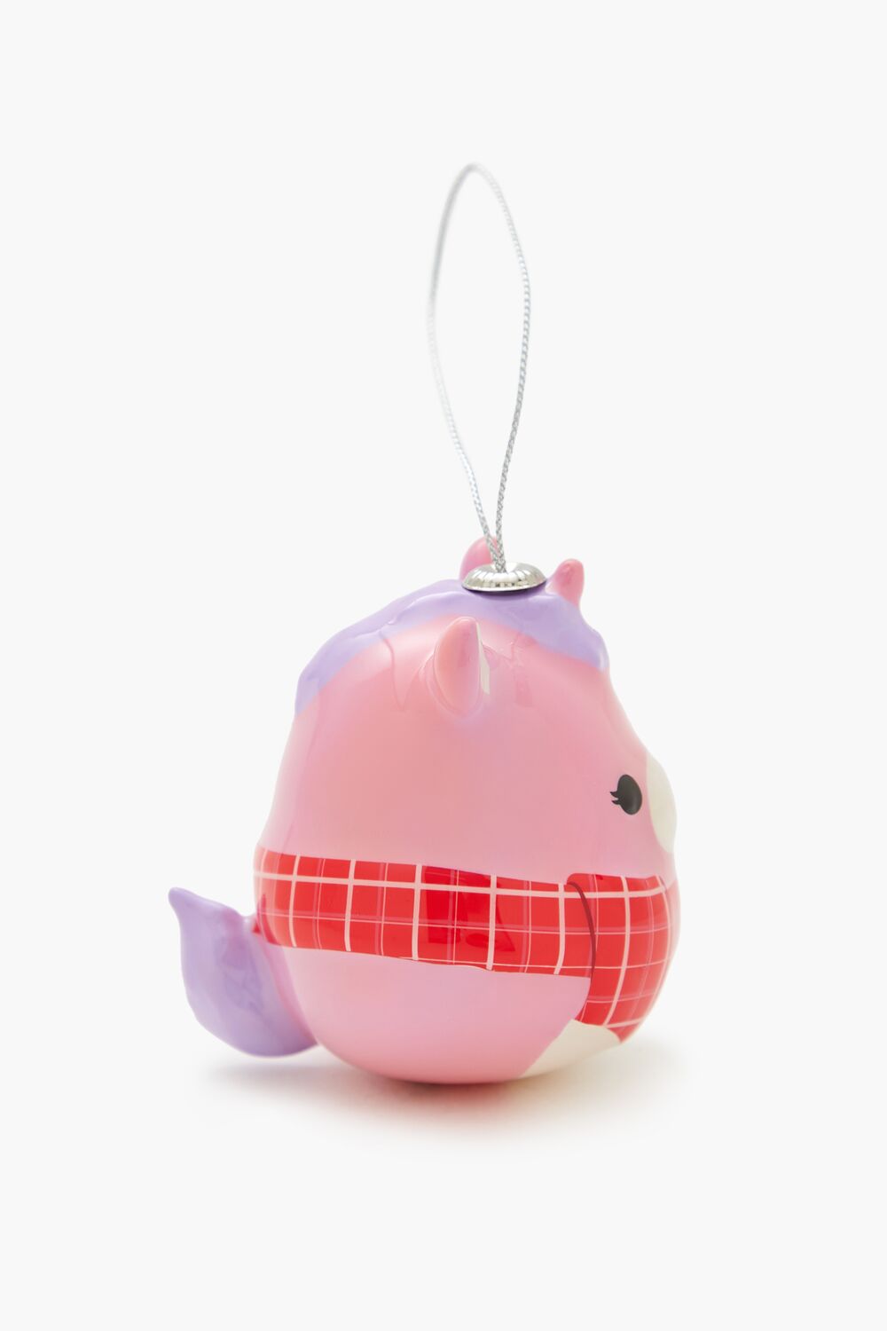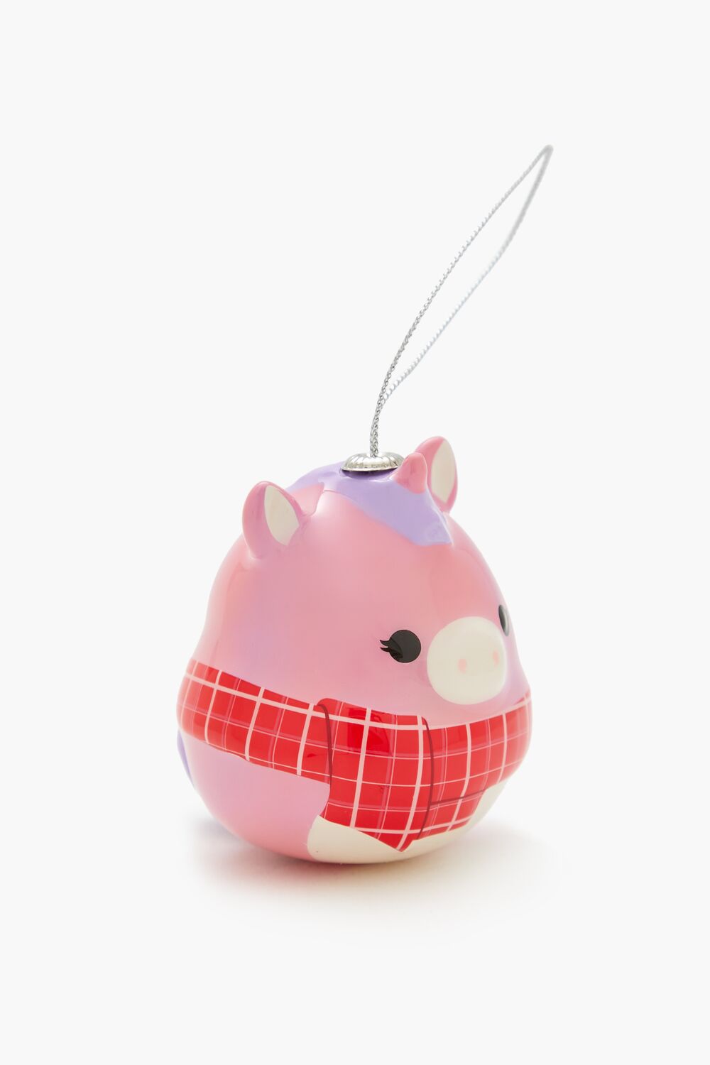 A Christmas ornament featuring a design of Squishmallows’ Lola wearing a plaid scarf.