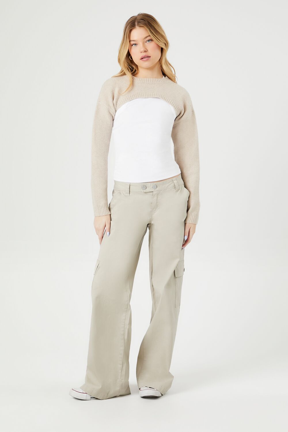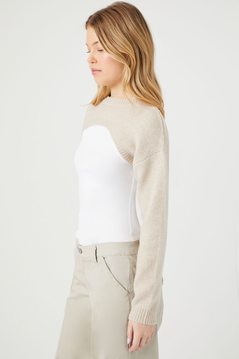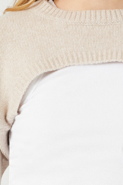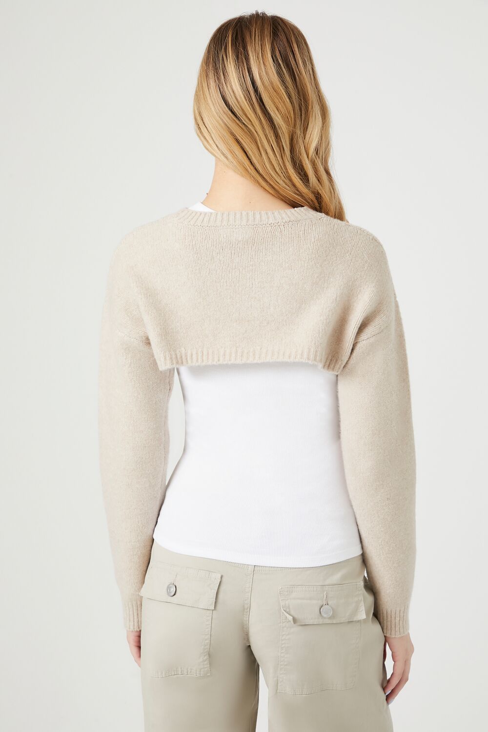 A knit sweater featuring a super cropped hem. ribbed trim. dropped shoulders. long sleeves. and a crew neck.