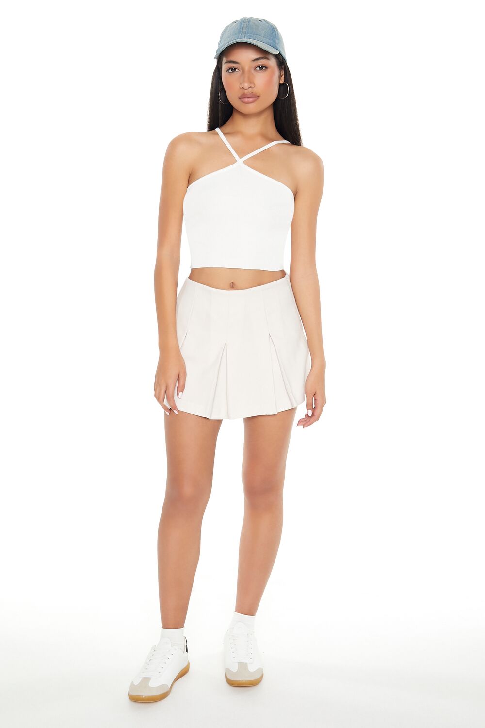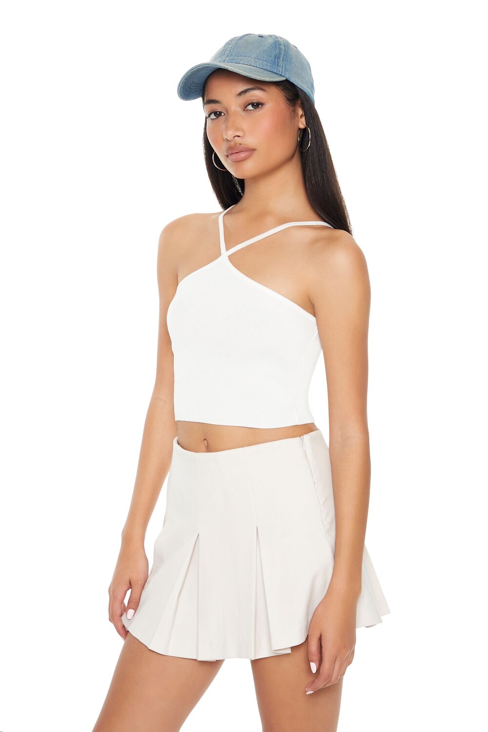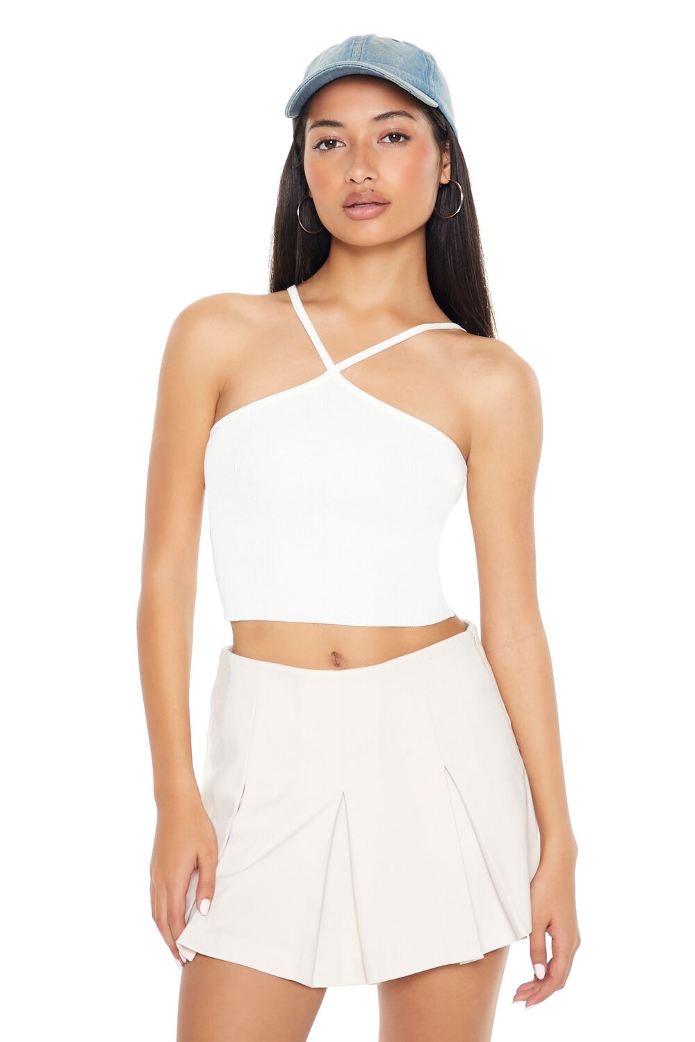 A sweater-knit cami featuring adjustable straps that form a V-strap front design. a straight-cut back. and a cropped hem.