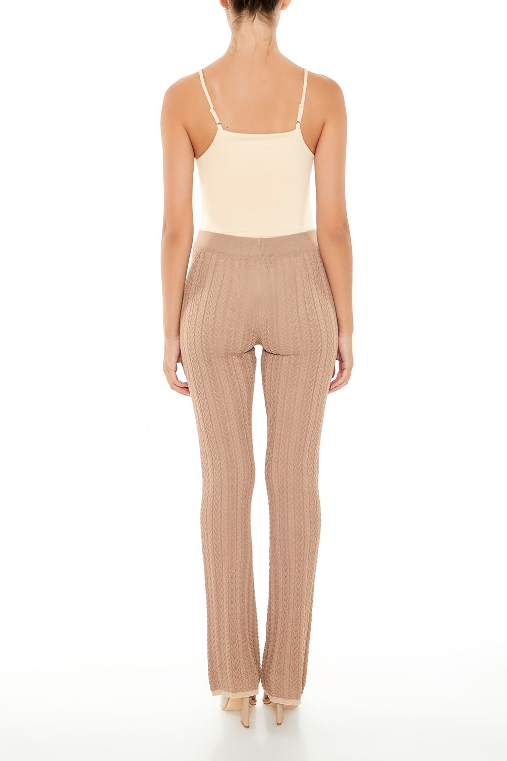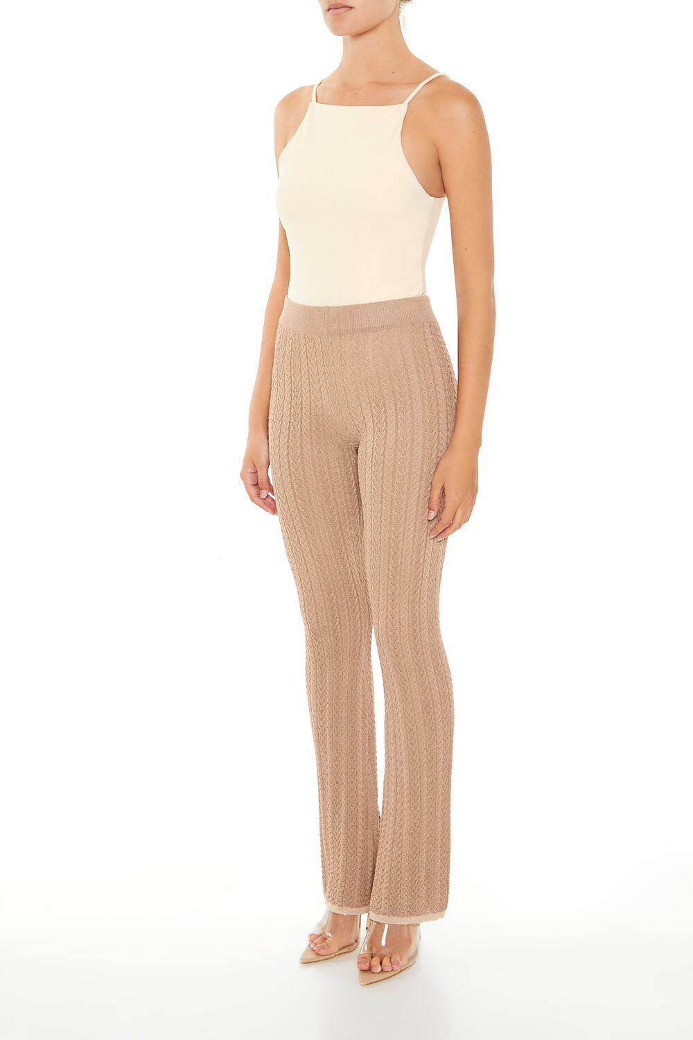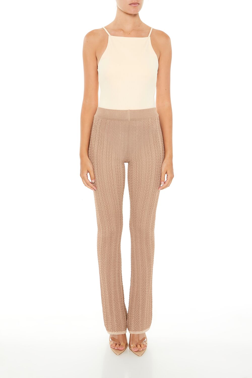 A pair of sweater-knit pants featuring a stretchy high-rise waistband and a flare leg.