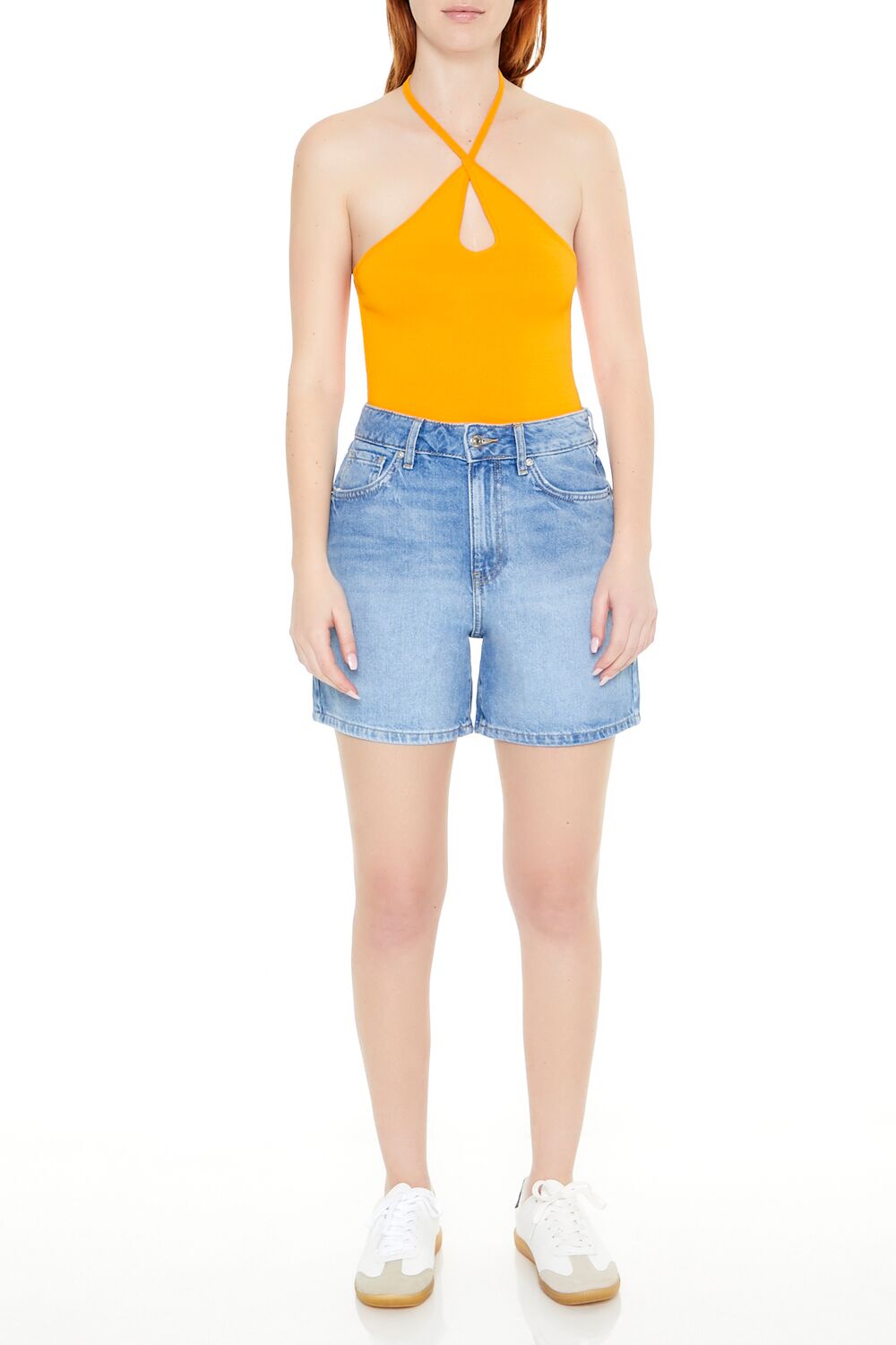 A sweater-knit bodysuit featuring a halter neckline. front keyhole. and a thong cut.