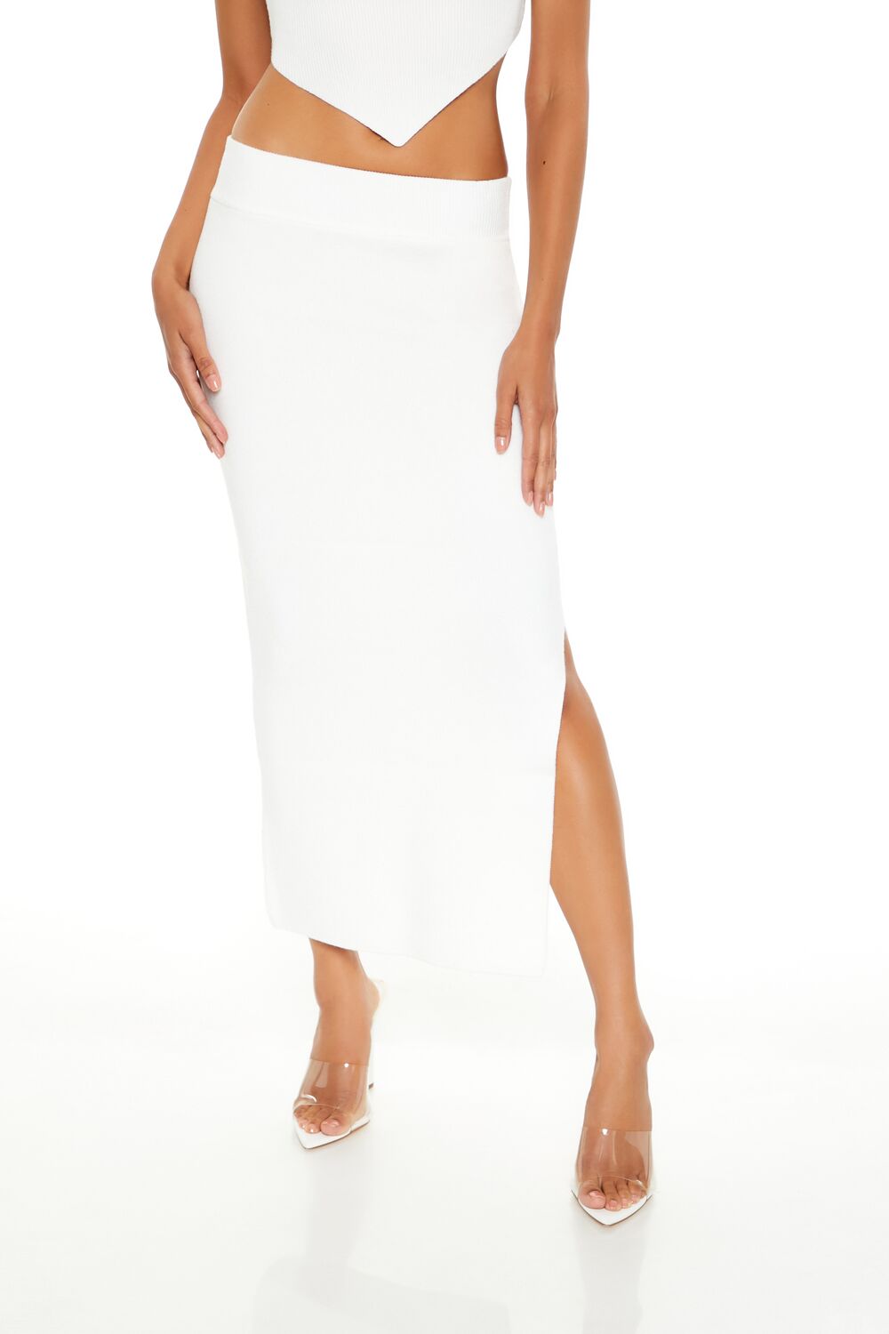 A sweater-knit midi skirt featuring a mid-rise waist. bodycon silhouette. and a side slit.