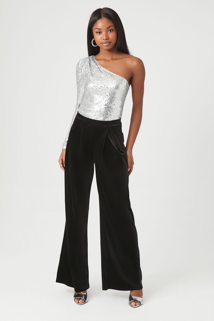 A pair of velvet pants featuring a high rise. front pleating. concealed back zipper. and a wide leg.